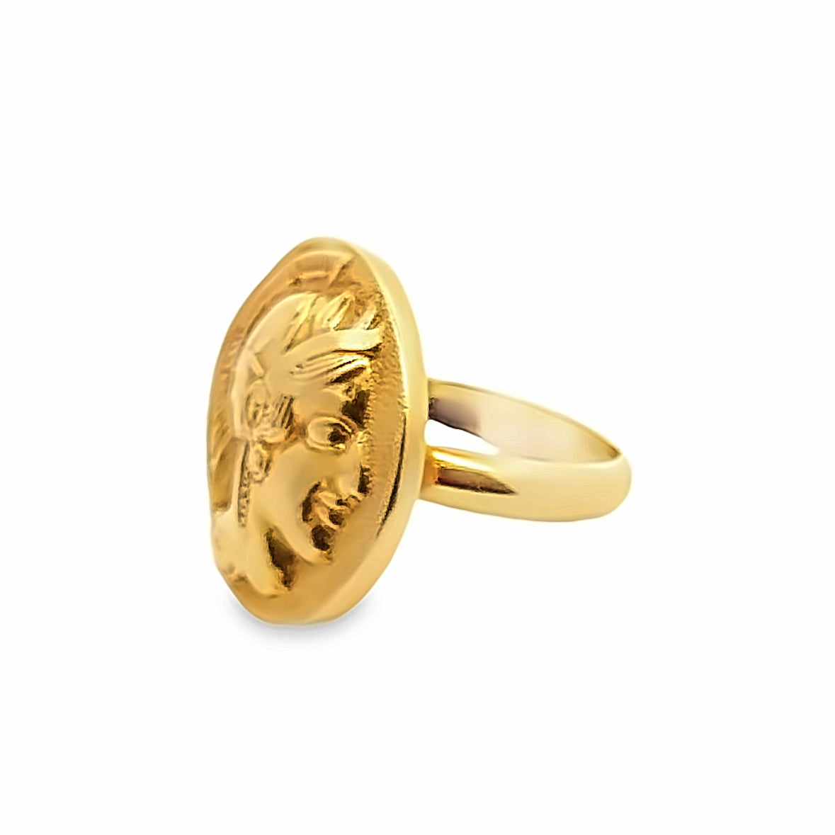 This exquisite ladies’ signet ring showcases a beautifully detailed sun disk, featuring an intricate profile of an Ancient Greek figure. Crafted in luxurious 18K solid gold, the ring exudes a timeless elegance and a rich, historical charm. The ancient profile is meticulously engraved, highlighting the artistry and craftsmanship of the design. Perfect for those who appreciate classical beauty and refined style, this ring is a unique and striking statement piece that honors the legacy of ancient Greece.