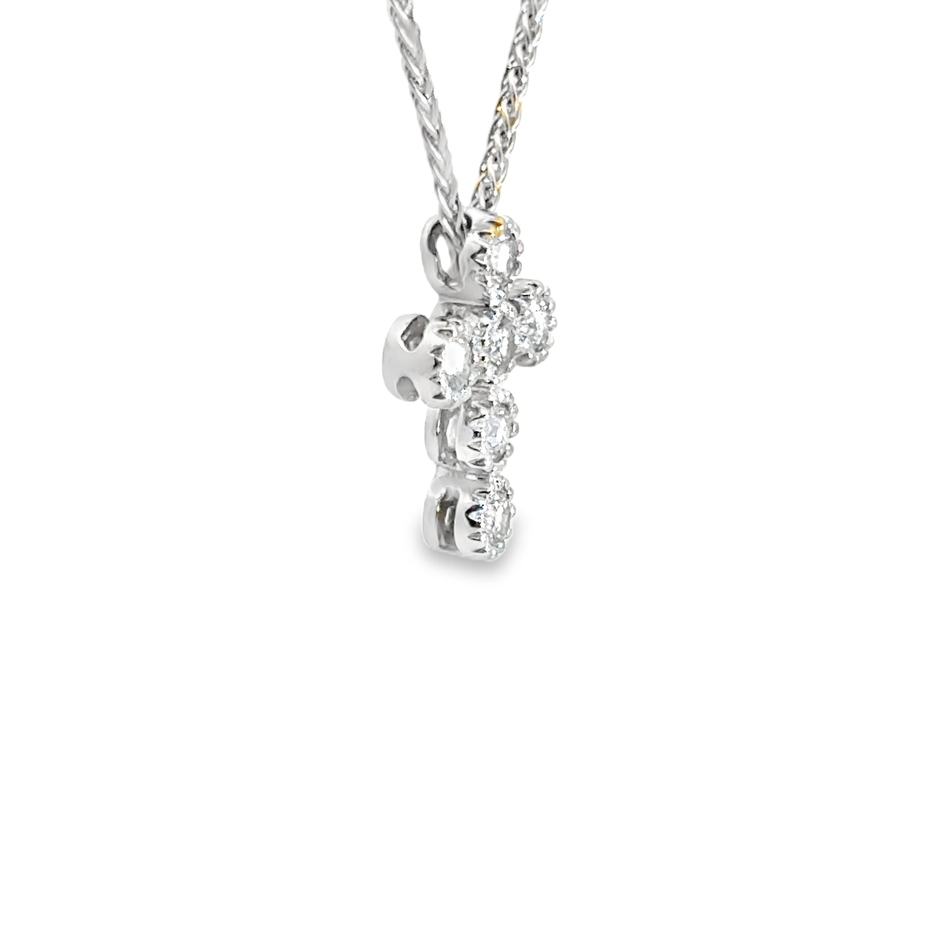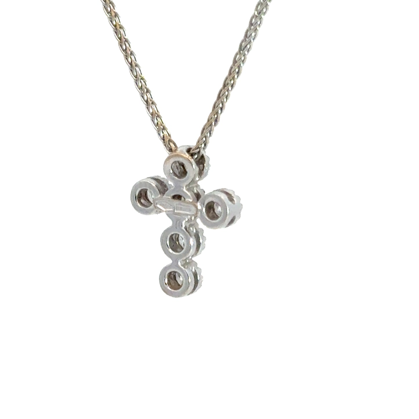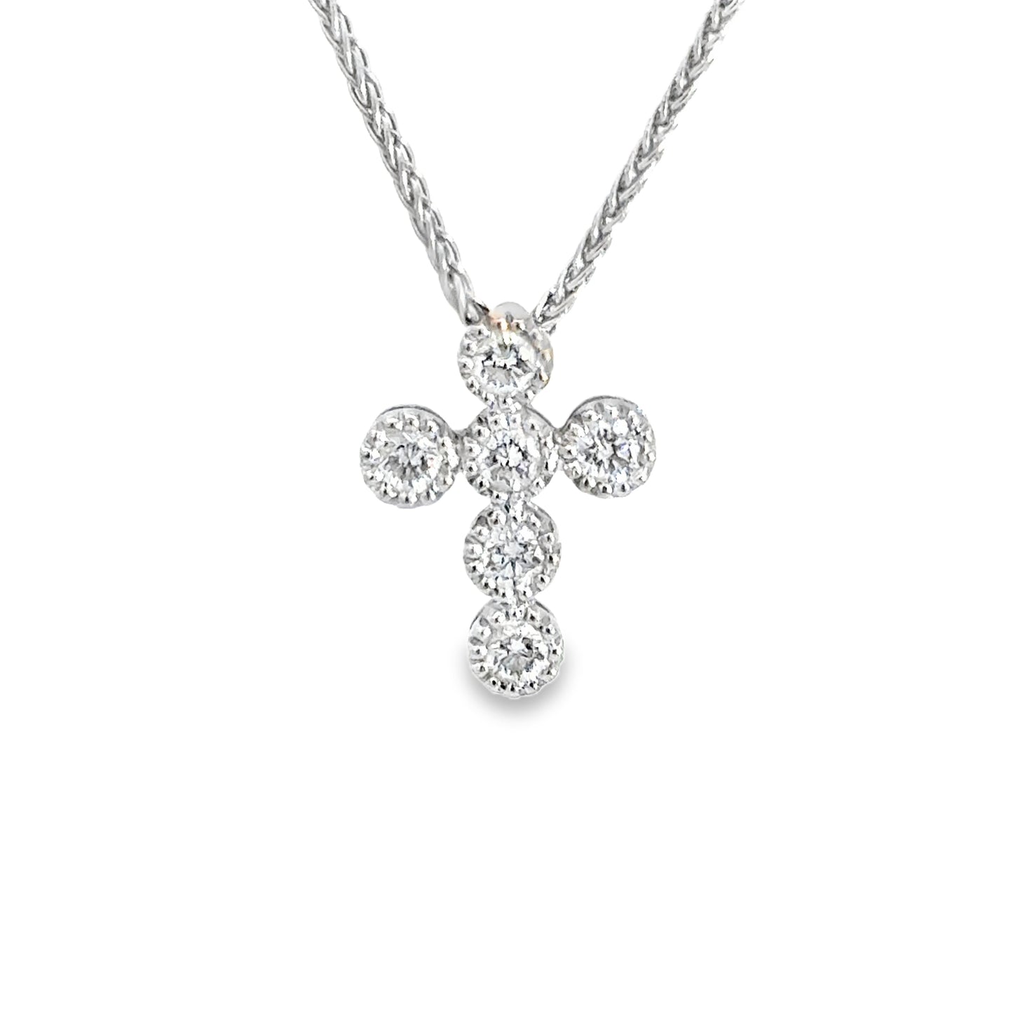 This elegant 18K white gold pendant features a modern cross design formed by seven round brilliant-cut diamonds, each set in a gleaming bezel-style mounting for maximum sparkle and dimension. The diamonds radiate with clarity and brilliance, creating a graceful and timeless symbol of faith and beauty. Suspended from a matching white gold chain, this necklace offers a refined statement of both devotion and luxury. Chain included.