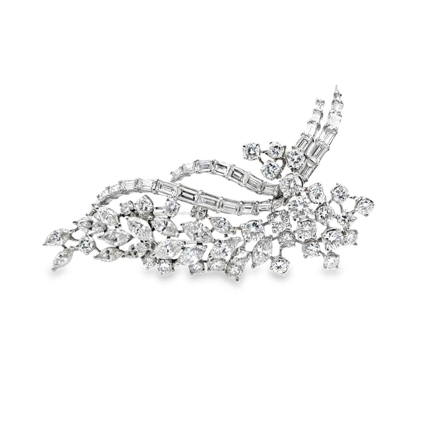 This is an exquisite platinum brooch showcasing an opulent design entirely encrusted with diamonds. The brooch features a flowing arrangement of marquise, round brilliant, and baguette-cut diamonds, creating a dynamic and sophisticated composition that resembles cascading leaves or floral sprays. The contrast between the elongated baguette diamonds and the brilliance of the round and marquise stones adds depth and texture to the design.