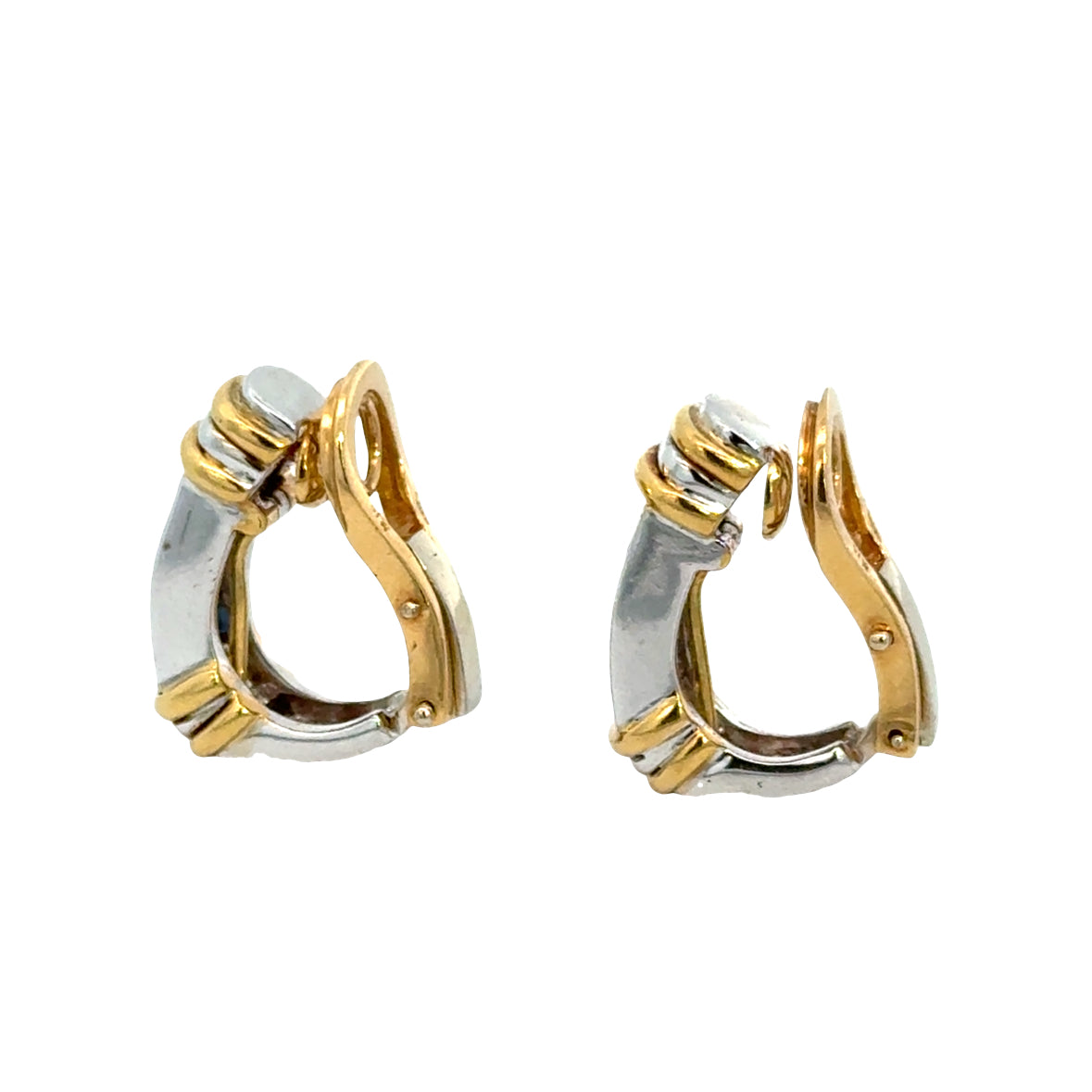Refined and timeless, these 18K white and yellow gold sapphire and diamond clip-on earrings showcase a sleek architectural design with elegant contrast. Vertical channels of richly colored sapphires alternate with brilliant VVS/G diamonds, all set within polished white gold frames and accented by warm yellow gold details. The clean lines and balanced proportions give these earrings a sophisticated presence, while the secure clip-on closure allows for comfortable wear without pierced ears. A classic yet distinctive design, ideal for both everyday elegance and evening refinement.
