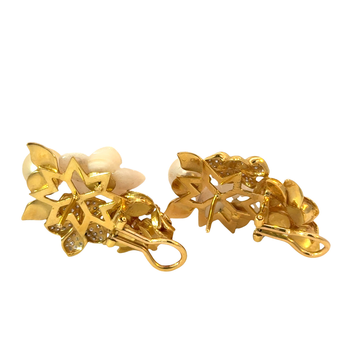 The design is richly dimensional, with exceptional attention paid not only to the front but also to the back of the earrings, where the goldwork remains beautifully finished and decorative. A carved floral element adds soft contrast and texture, enhancing the romantic, garden-inspired aesthetic.