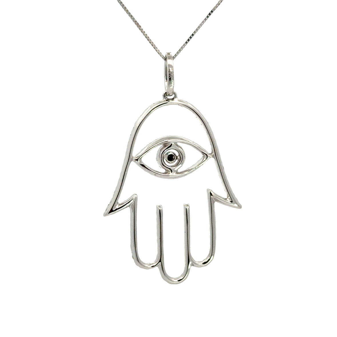 A striking and meaningful Diamond Hamsa pendant crafted in 18K white gold and suspended from a classic 14K white gold box chain.
