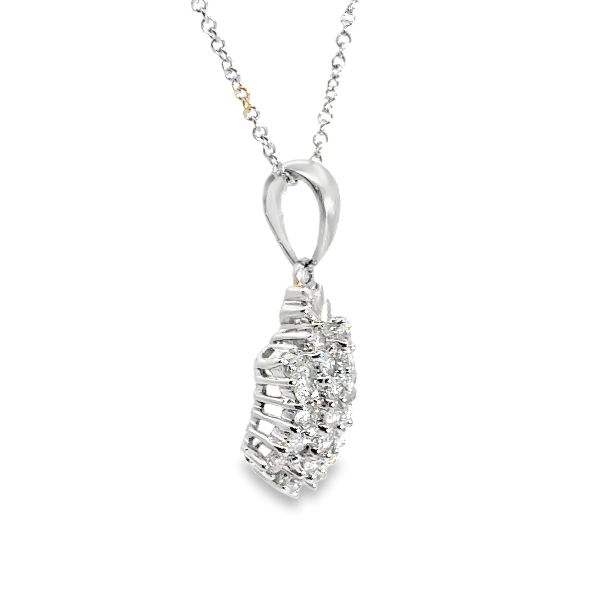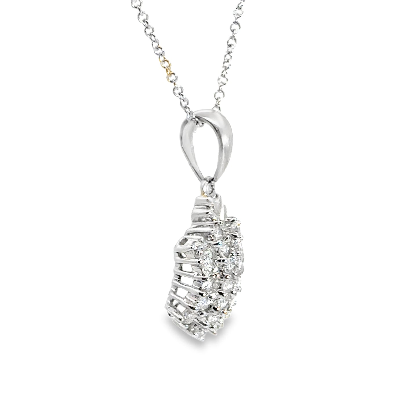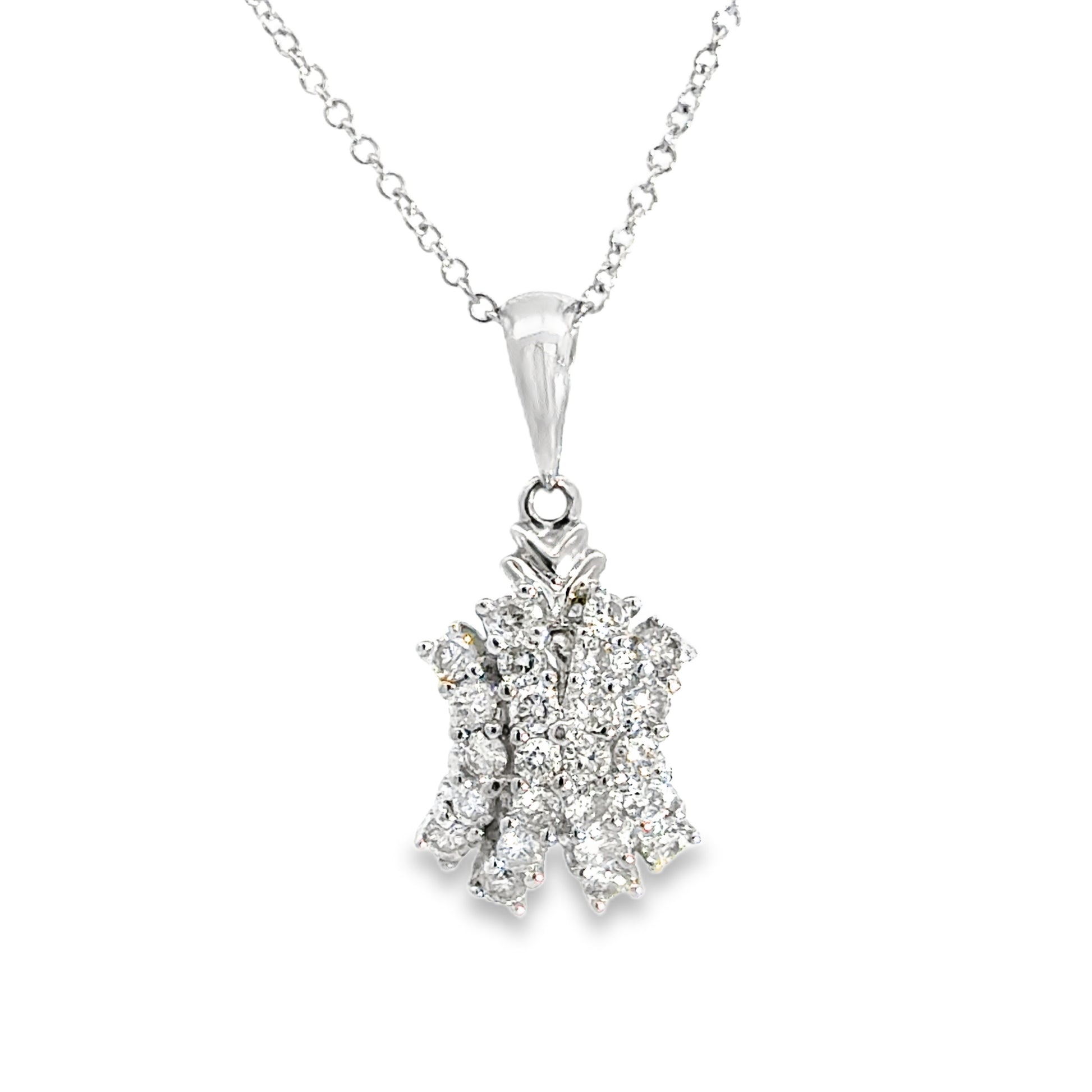 Radiant and refined, this 14K white gold pendant showcases a stunning cluster of round-cut diamonds arranged in an intricate design. The multi-dimensional setting adds texture and brilliance, while the high-polish white gold enhances the sparkle of each stone. Suspended from a matching chain, this eye-catching piece brings classic elegance with a contemporary twist—perfect for both everyday luxury and special occasions. Chain included.