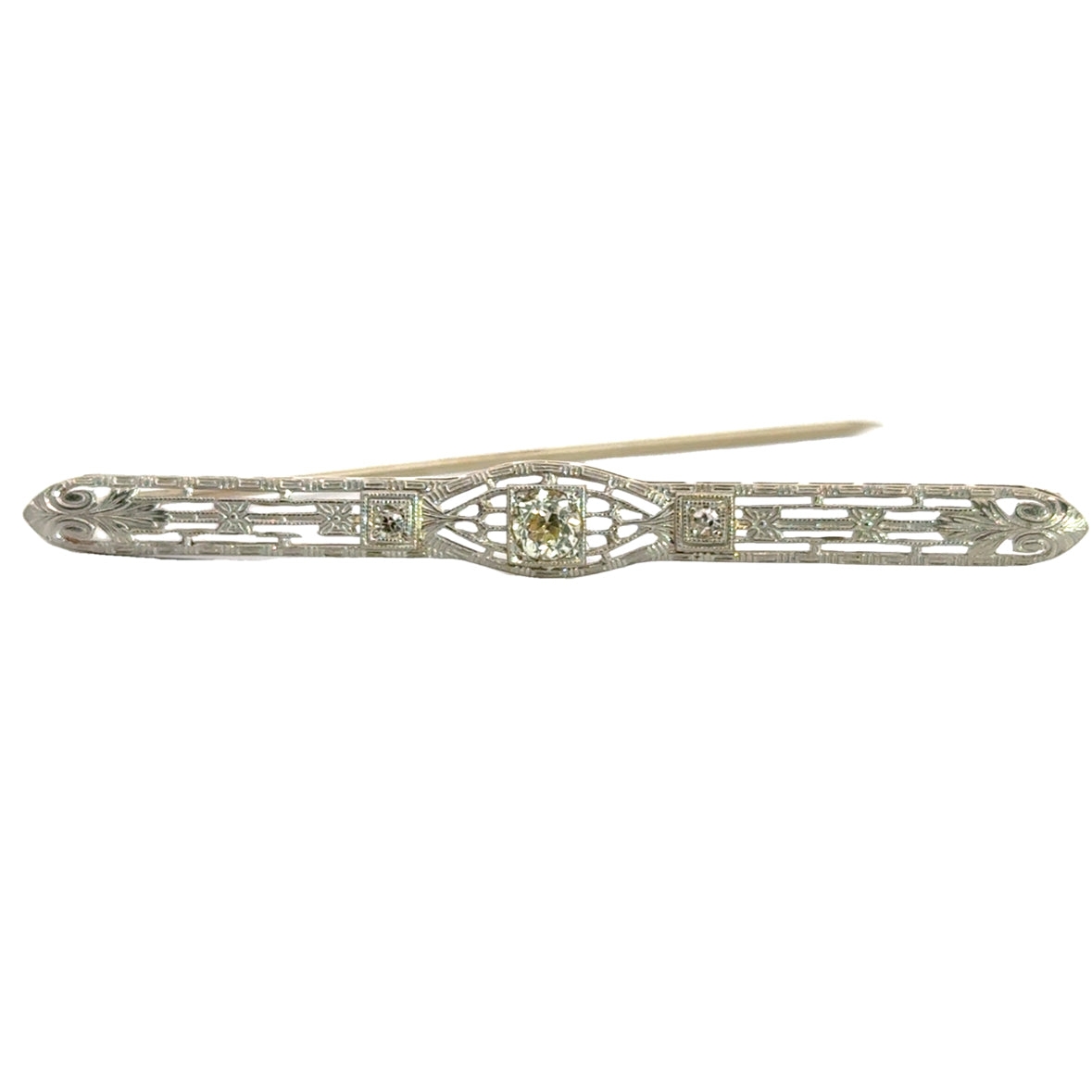 This elegant 14K white gold bar pin features a delicate openwork filigree design, characteristic of the Art Deco era. The intricate geometric lattice pattern is accentuated by three round-cut diamonds, bezel-set within milgrain-edged square frames, adding a touch of brilliance and sophistication.