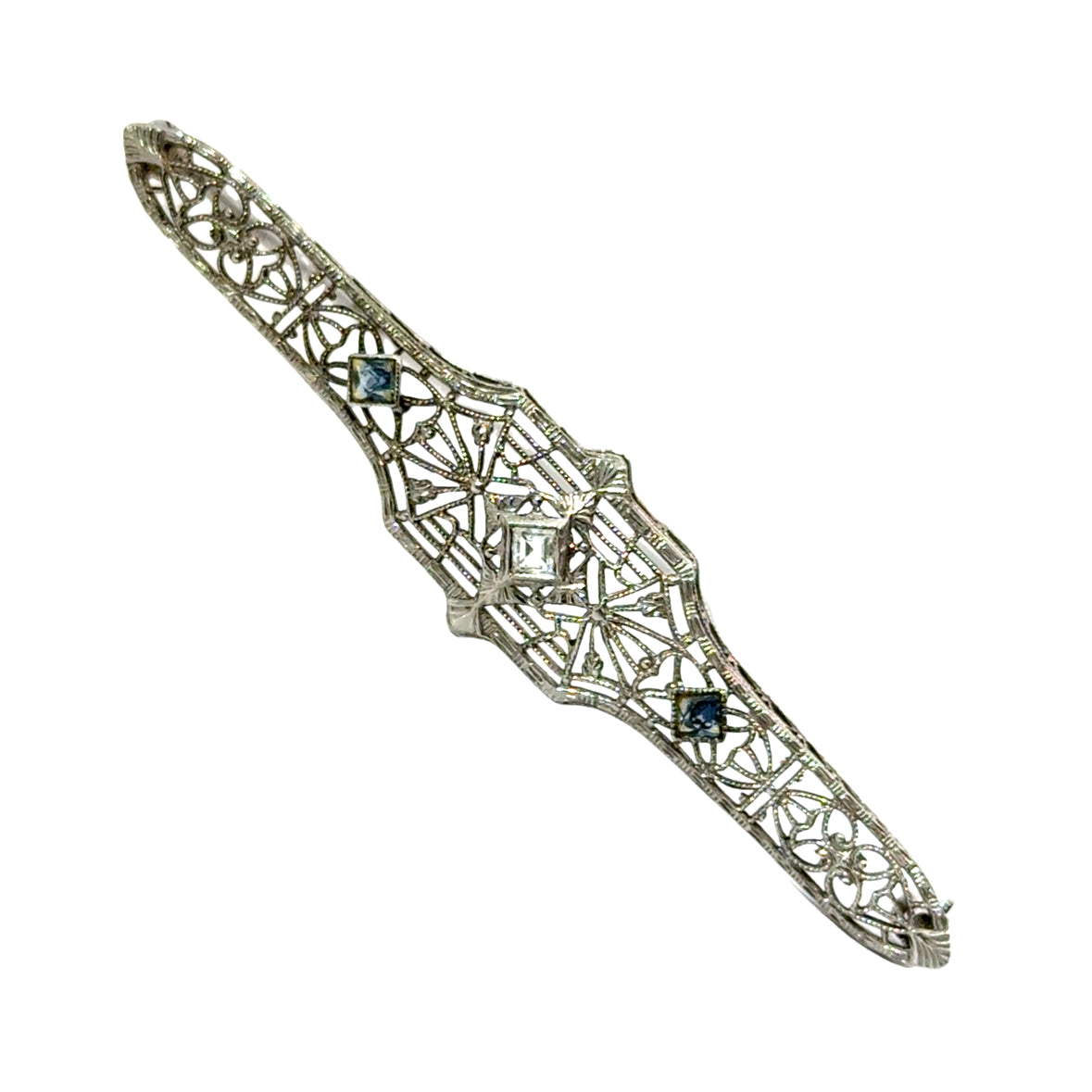 This elegant 1920s Art Deco bar pin is crafted in 14K white gold, featuring an intricate filigree design with geometric and floral-inspired motifs. The elongated shape is accentuated by delicate openwork patterns, creating a lace-like effect that reflects the expert craftsmanship of the Art Deco era.