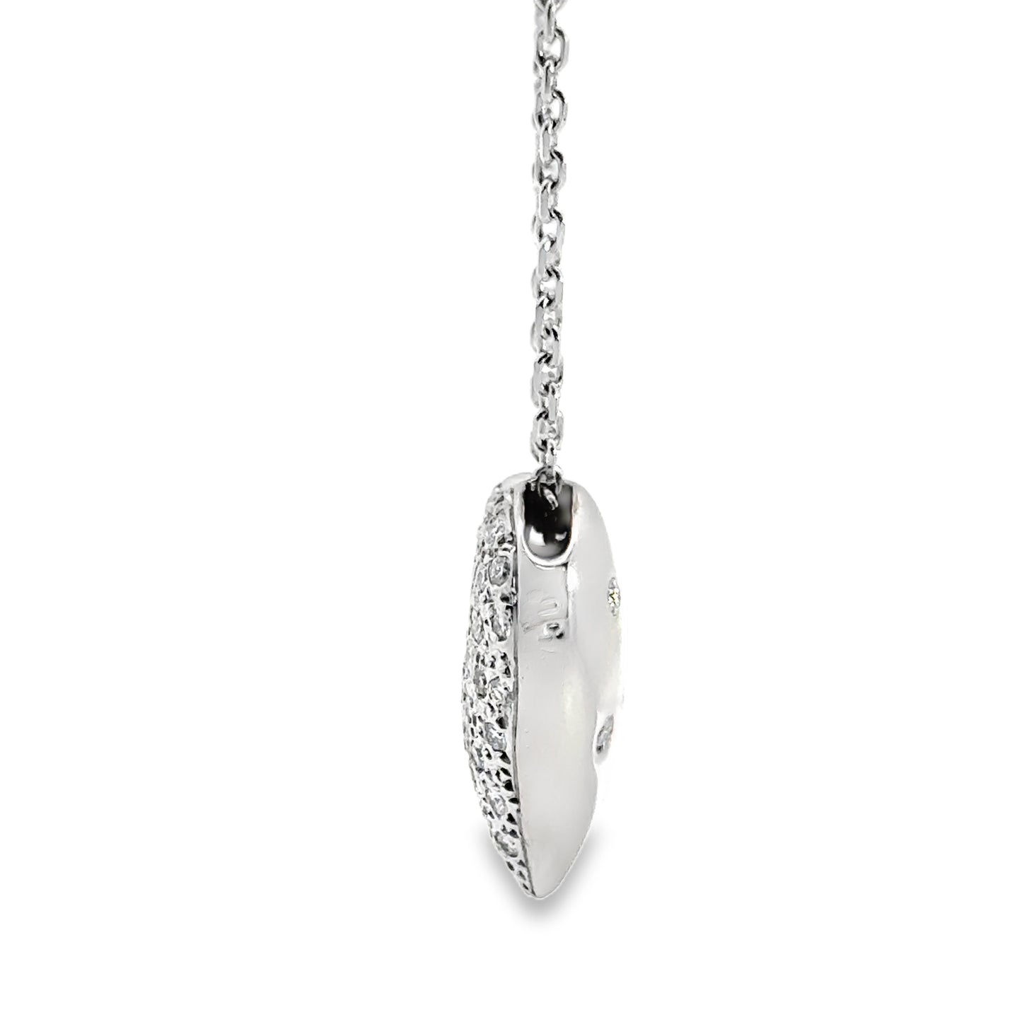 The back of the pendant has a smooth, polished finish with a few flush-set diamonds, adding a subtle touch of sparkle. The design ensures that the pendant looks beautiful from every angle. Suspended from a delicate white gold chain, this puff heart pendant is a timeless and elegant accessory, perfect for adding a touch of sophistication and sparkle to any outfit.