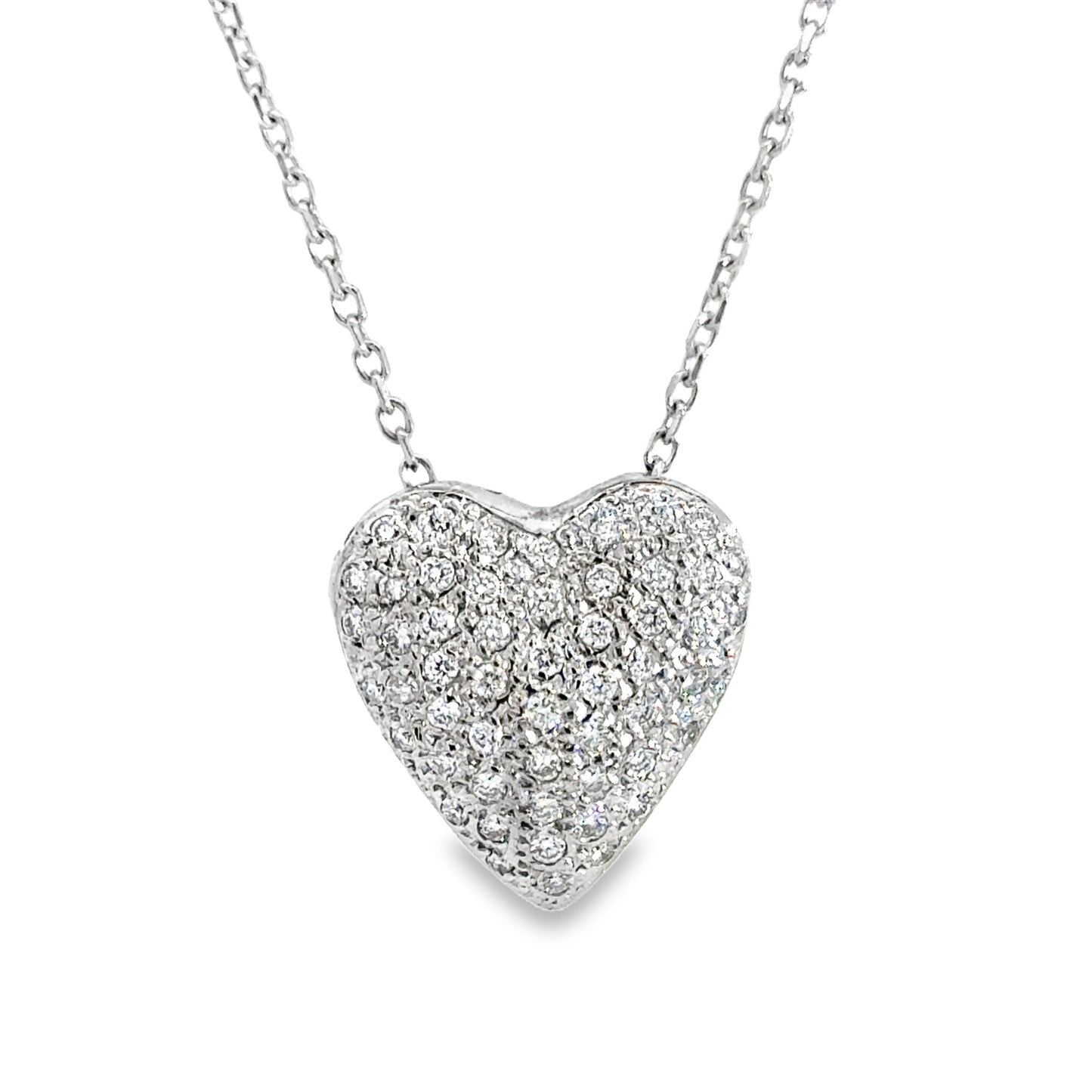 This exquisite 18K white gold puff heart pendant is adorned with a stunning array of diamonds, creating a luxurious and romantic piece. The front of the heart features a pavé setting, densely covered with diamonds that give the pendant a shimmering, textured surface. The puffed, three-dimensional shape of the heart adds depth and volume, making it stand out elegantly when worn.