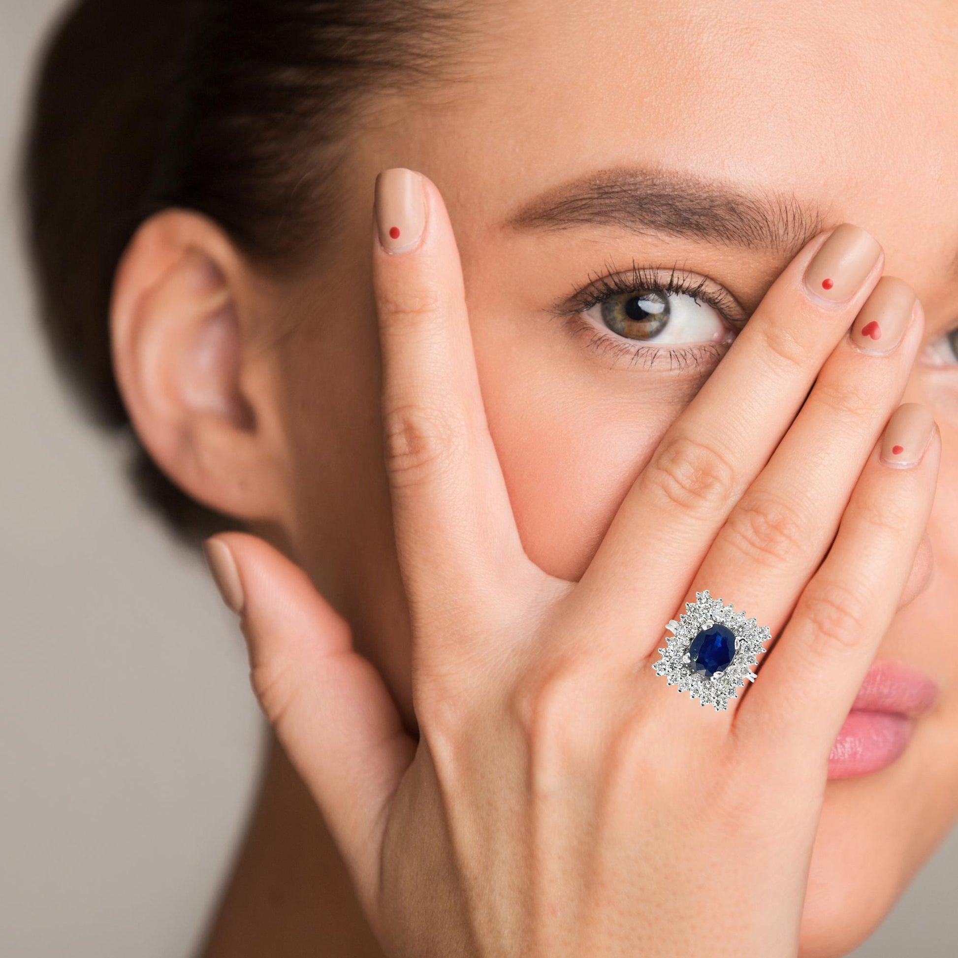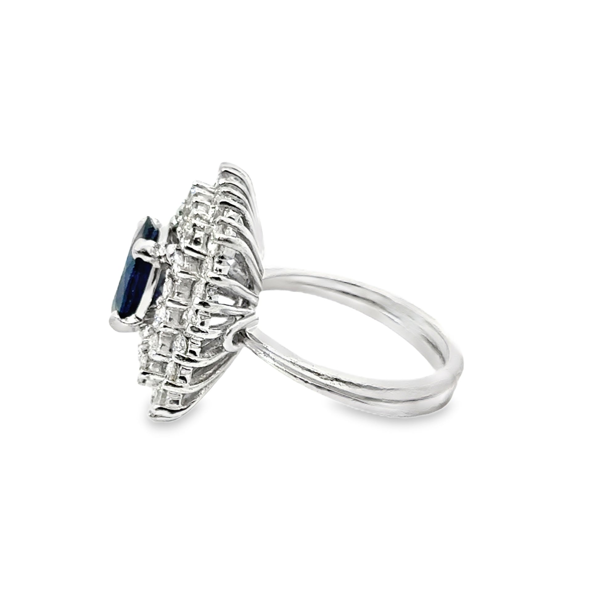 Make a bold statement with this dazzling vintage cocktail ring. Crafted in 14K white gold, this 1980’s design features a stunning oval-cut sapphire, approx. 3.5 carats, in a deep, rich blue hue. The sapphire is surrounded by a spectacular double halo of round brilliant-cut diamonds, totaling approx. 2.55 carats, VS clarity and G–H color, creating a sparkling rectangular cluster that commands attention.