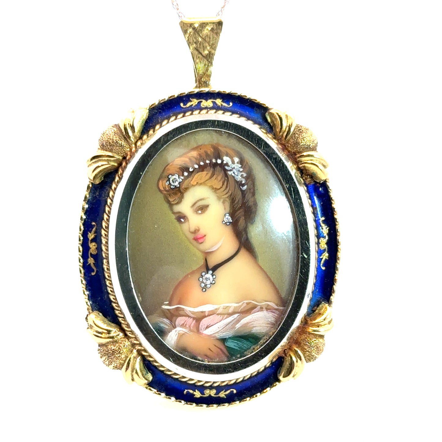 This exquisite vintage brooch/pendant showcases a finely painted portrait of a lady adorned with diamond accents in her hair, earrings, and necklace, adding delicate sparkle and charm. Framed in rich royal blue enamel with intricate 18K yellow gold scrollwork and shell details, the piece resembles a miniature antique picture frame. It features both a pin back and a bail, allowing it to be worn as either a brooch or pendant. A true conversation piece that merges artistry, history, and elegance—perfect for collectors and lovers of unique retro jewelry.
