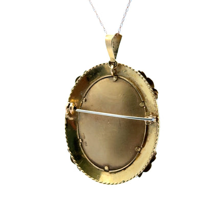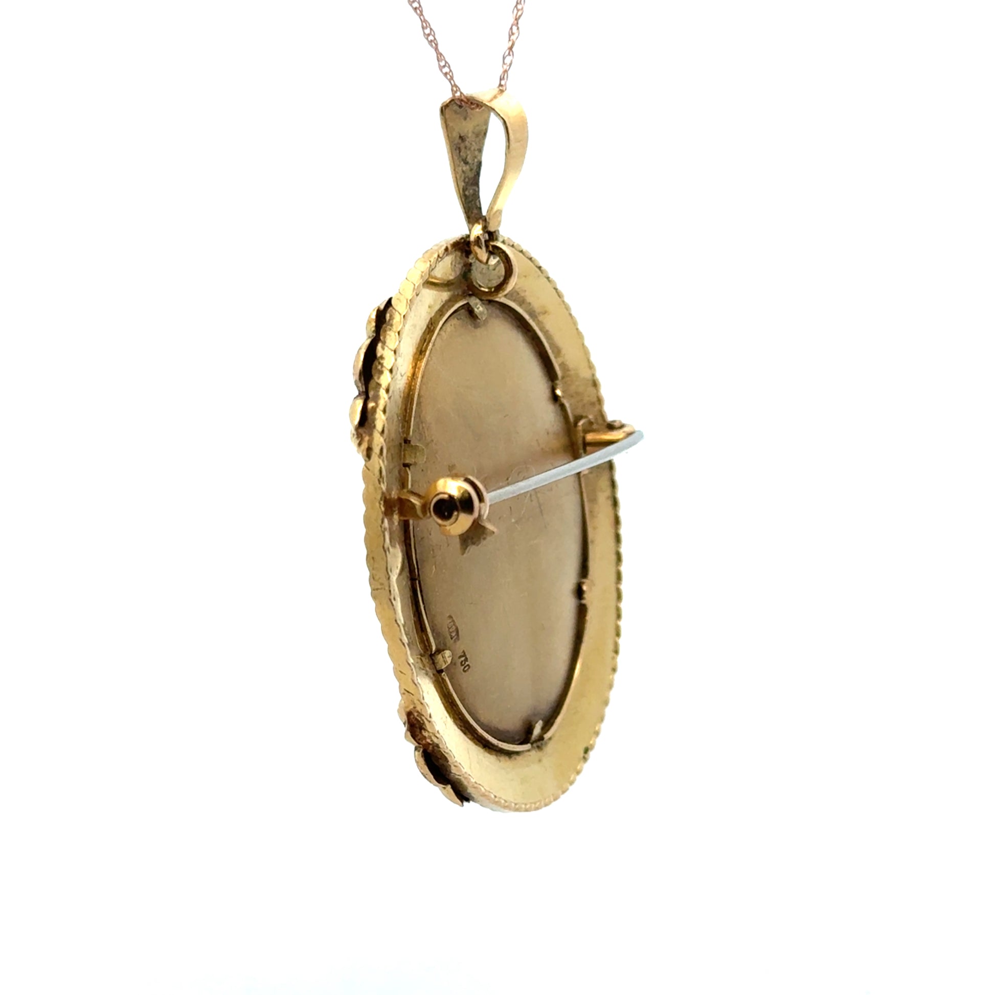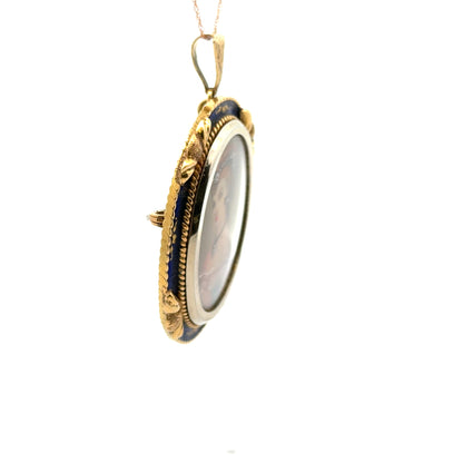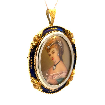 18K Yellow Gold Portrait Brooch/Pendant with Enamel Frame & Diamond Accents – Retro Elegance