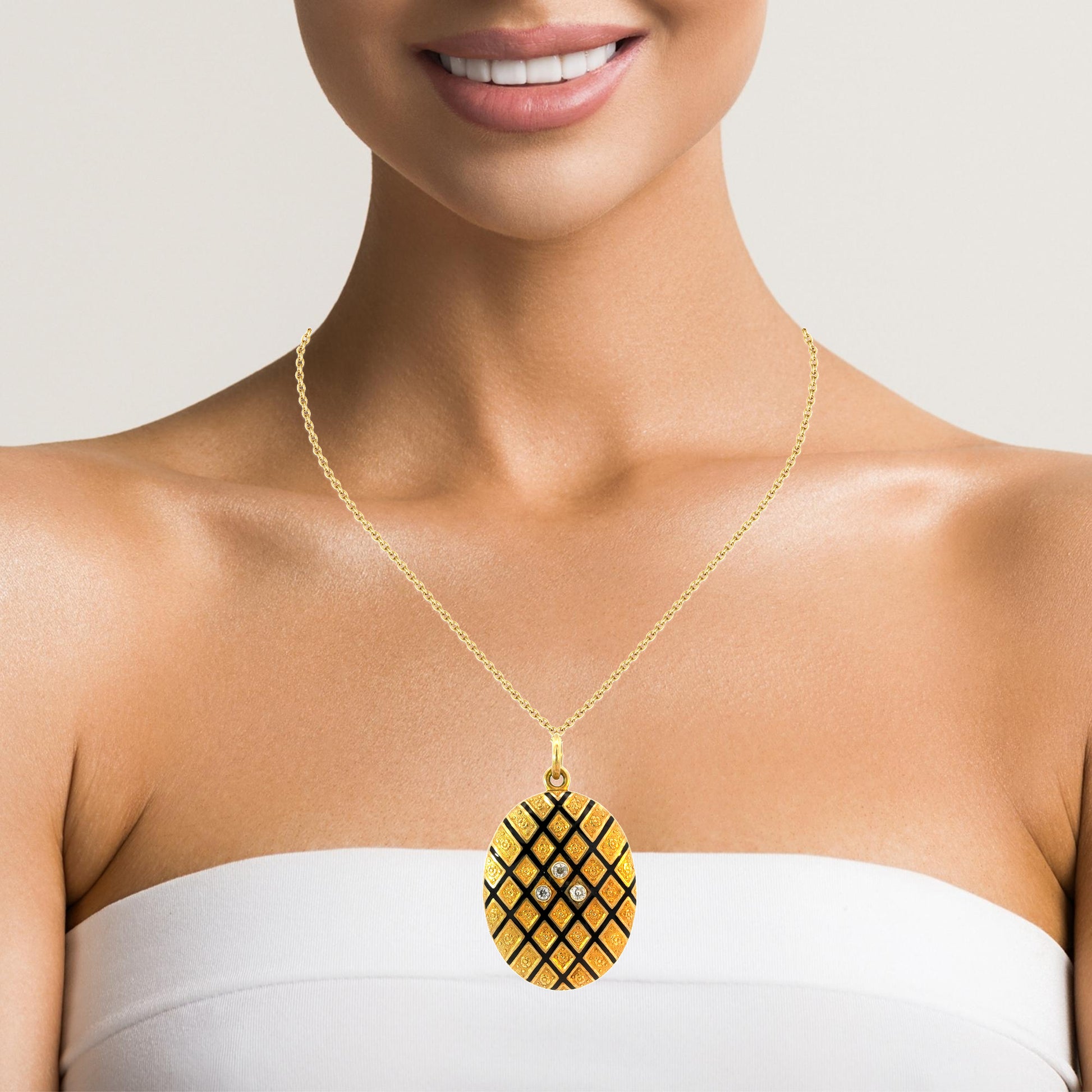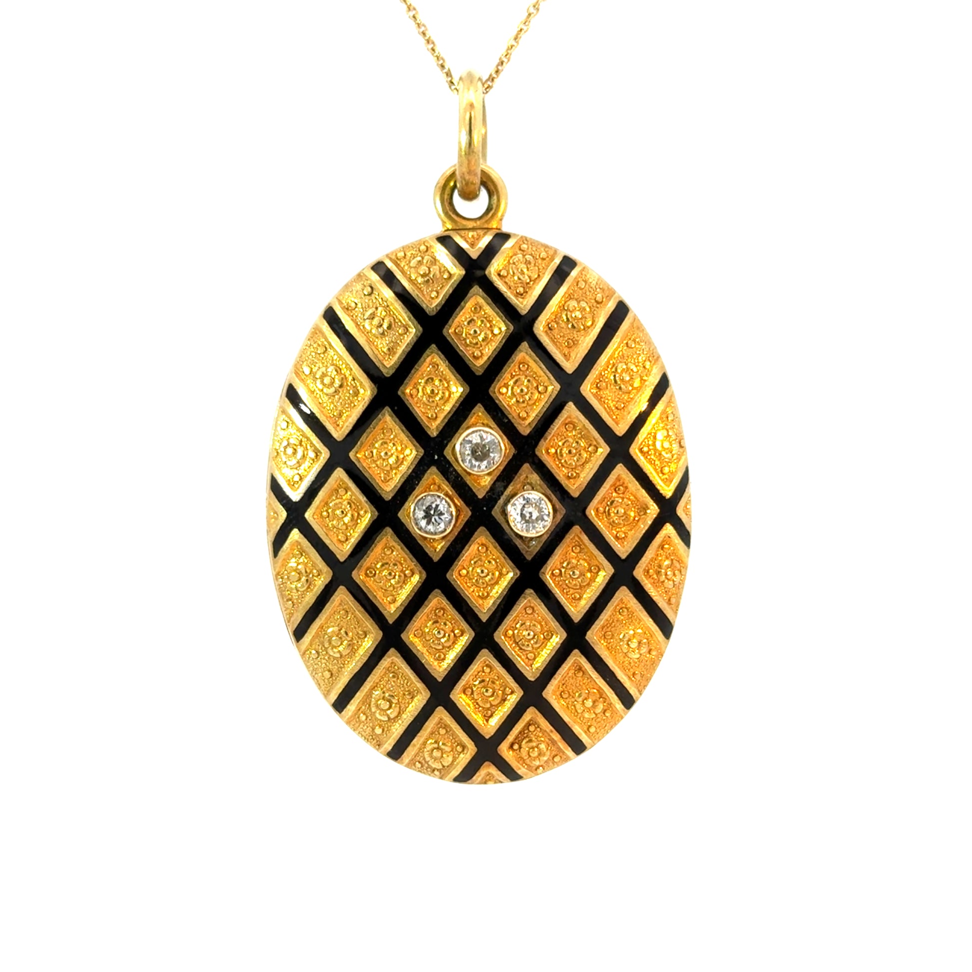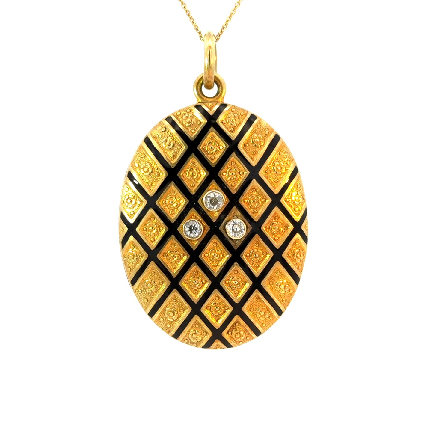 18K Yellow Gold, 3 Round-Cut Diamonds Approx.0.45ct., Black Enamel Lattice, Approx.45mm x 34mm, chain not included |