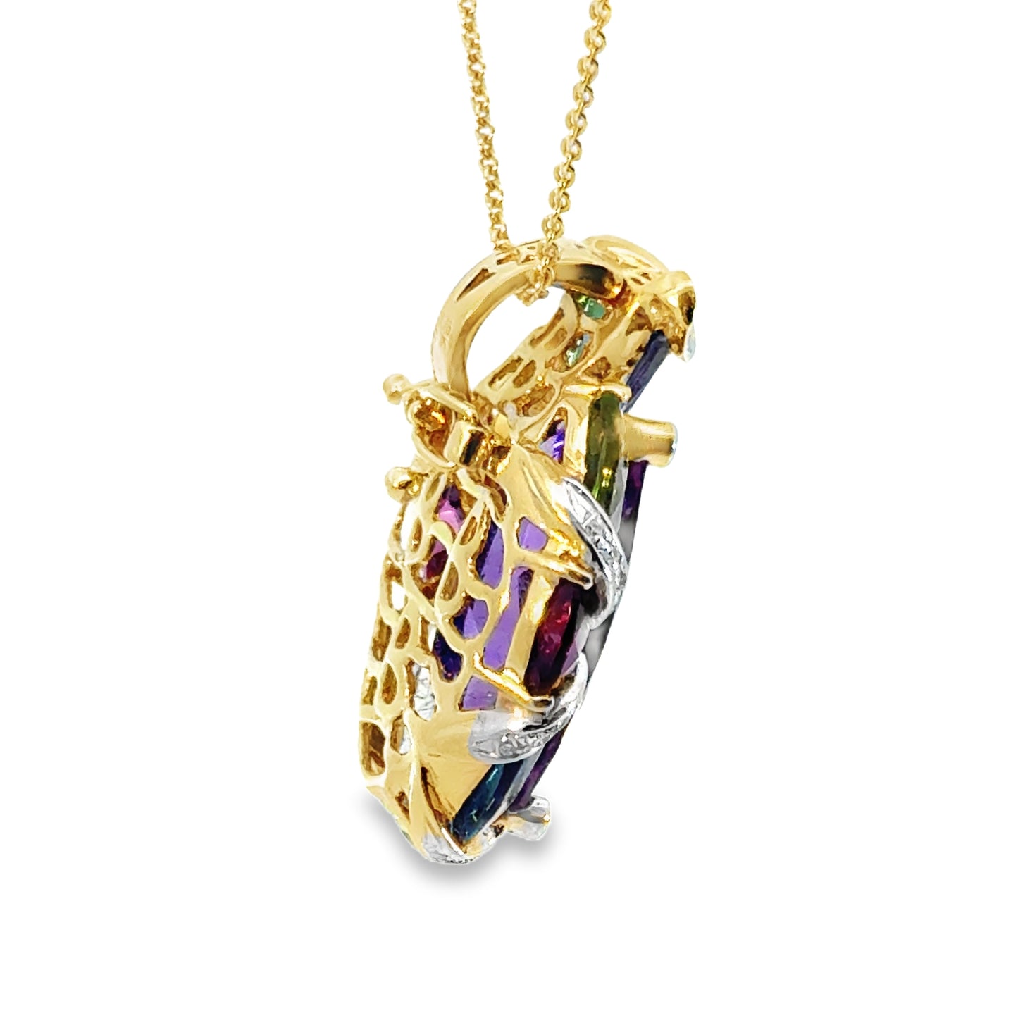 The openwork gallery on the back of the pendant features an ornate, sculptural gold lattice, allowing light to flow through the gemstones and enhance their natural radiance. This Bellari piece is a true statement of elegance, craftsmanship, and vibrant beauty, making it a standout addition to any fine jewelry collection.