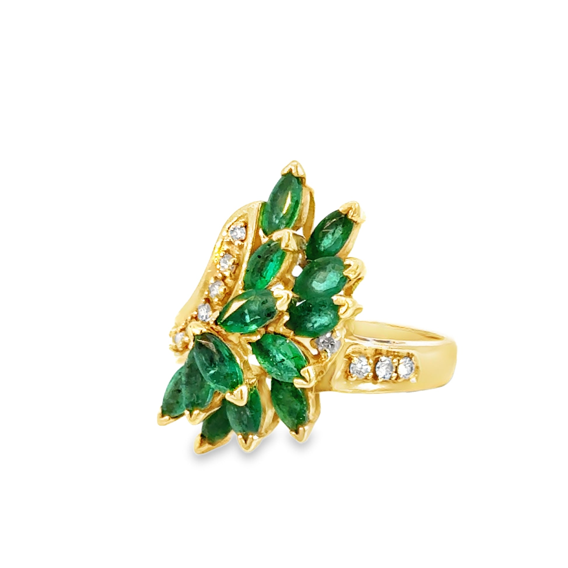 Radiant and bold, this 14K yellow gold ring celebrates the natural elegance of emeralds in a sweeping, leaf-inspired design. Marquise-cut emeralds—totaling approximately 1.30 carats—are artfully arranged in a graceful cluster, forming the shape of delicate leaves that catch the light from every angle. Sparkling round brilliant diamonds, approximately 0.10 carats, accent the curved band and add a refined touch of brilliance.