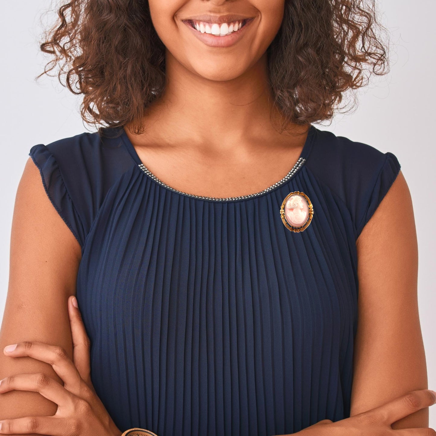 The surrounding gold frame is ornately designed, with intricate floral motifs and delicate texturing, adding to its antique charm. The soft pink and white tones of the shell create a beautiful contrast, enhancing the relief of the portrait. This type of jewelry was popular in the Art Nouveau and early Art Deco eras.