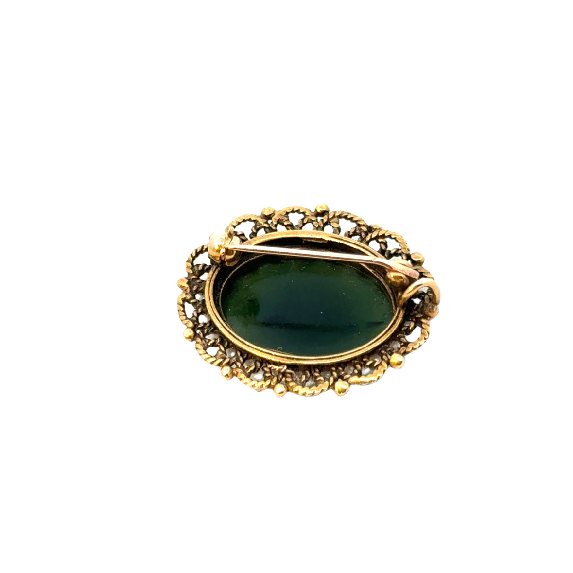 This exquisite 14k yellow gold brooch/pendant features a striking oval jade cabochon at its center, surrounded by an intricate halo of seed pearls. The deep green jade stone is smooth and polished, showcasing its natural luster and rich hue. Encasing the jade is an ornate gold filigree border, delicately crafted with fine detailing that highlights the piece’s vintage charm. The seed pearls provide an elegant contrast, enhancing the brooch’s timeless and sophisticated appeal. Designed with both a pin mechanism and a hidden bail, this versatile piece can be worn as a brooch or pendant, making it a beautiful and functional addition to any jewelry collection.