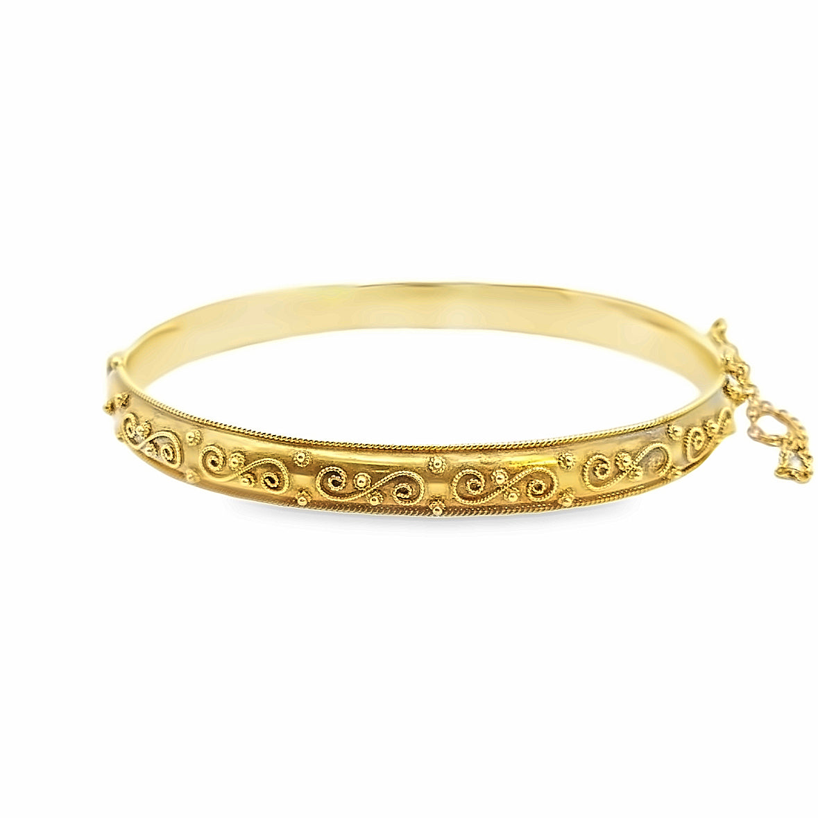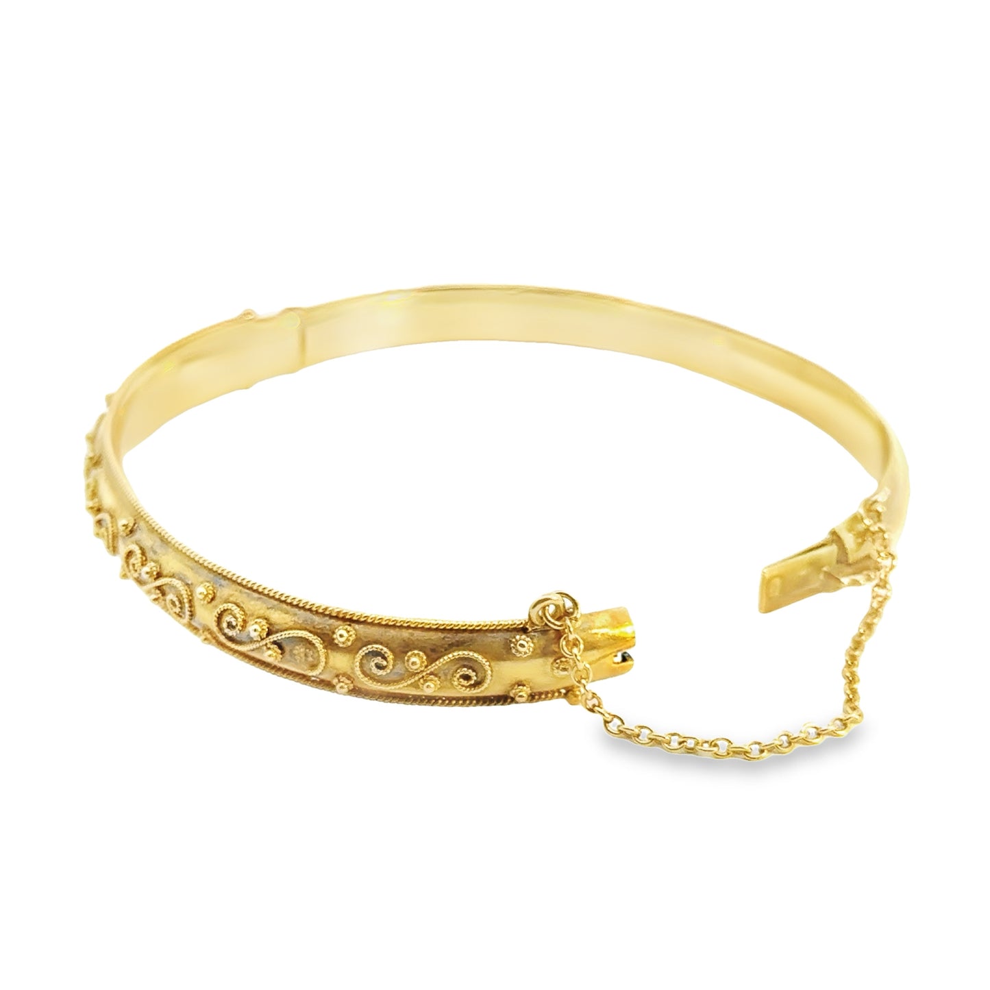 Adorn your wrist with timeless elegance. This exquisite antique, Victorian-inspired gold bangle, features an intricate filigree pattern, bringing a touch of sophistication and old world charm. It's the perfect accessory for those who appreciate classic beauty and craftsmanship.