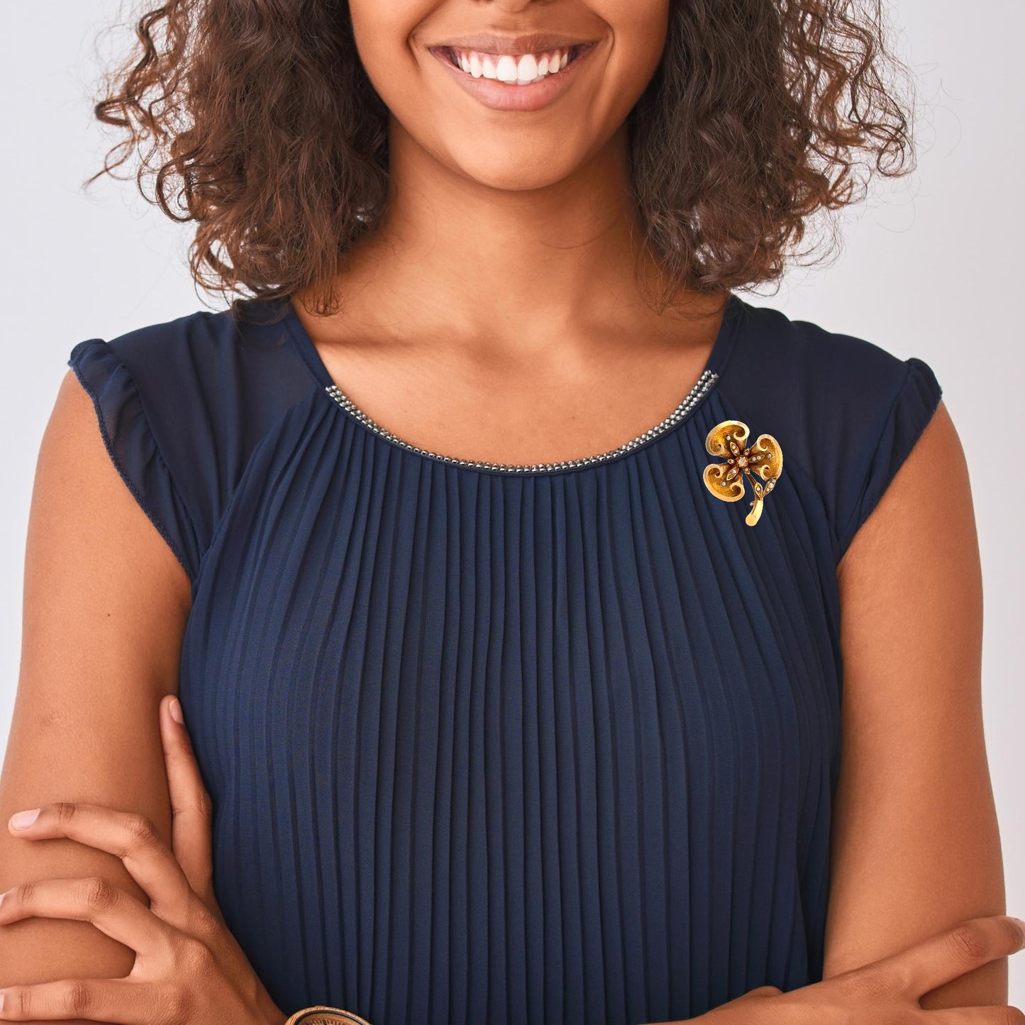 This exquisite antique brooch, dating back to the 1800s, is crafted in 18k yellow gold and features a floral-inspired design with intricate, ornate detailing characteristic of the Victorian era. The four petals showcase elegant openwork scrolls and a textured gold finish, adding depth and sophistication to the piece.