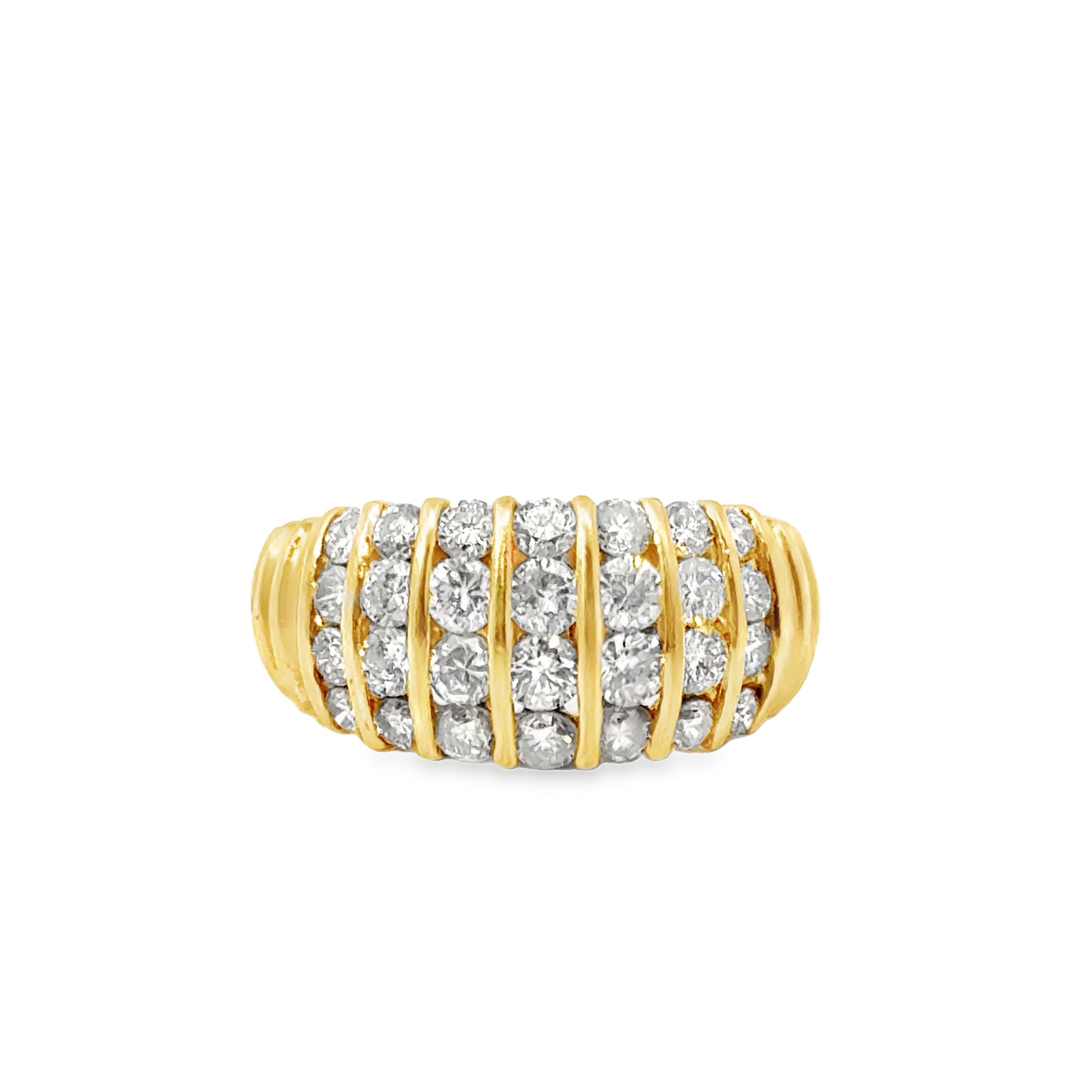 This eye-catching diamond band features approximately 1.20 carats of sparkling round brilliant diamonds, graded VS/H for quality and brilliance. The diamonds are set in six rows, each framed by sleek yellow gold bars, creating a bold and structured look. The band graduates from about 9 mm in the front to 4 mm in the back, ensuring both a statement presence and a comfortable fit. A versatile ring that can be worn as a right-hand statement piece or a striking anniversary band.