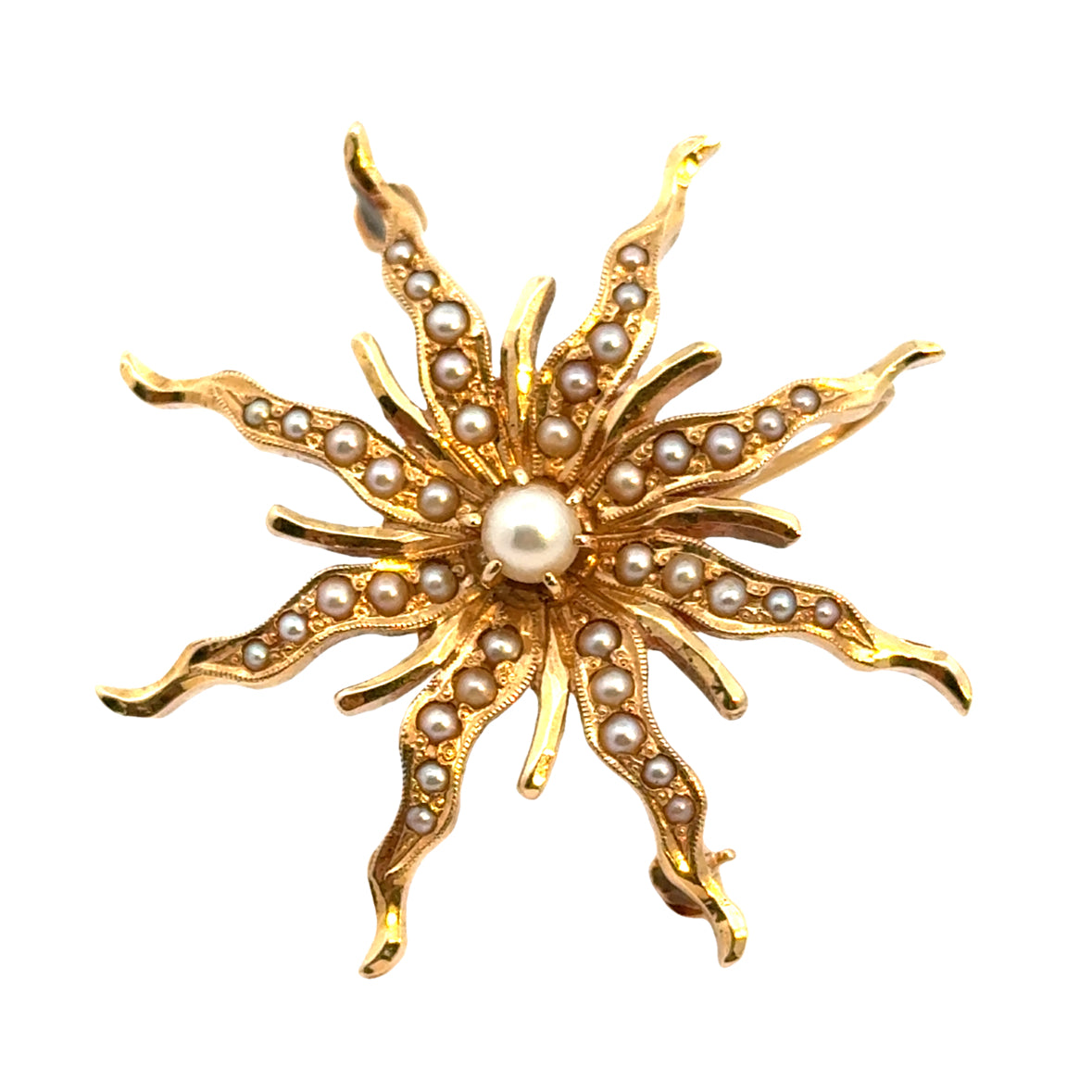 Vintage 14K Yellow Gold & Seed Pearls Sunburst Brooch/Pendant