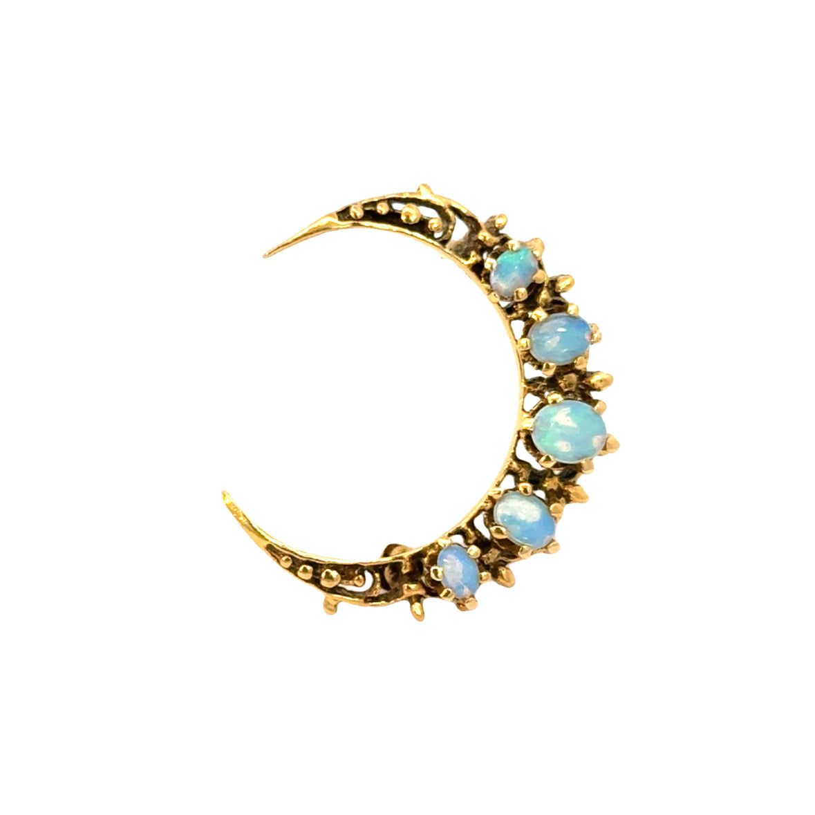 This elegant 14k yellow gold brooch features a classic crescent moon design, adorned with a row of vibrant, round-cut opal cabochons. The opals exhibit a mesmerizing play of colors, with soft blue and green iridescent hues that shift beautifully in the light. The gold crescent is accented with intricate, decorative detailing, giving the piece a vintage-inspired charm. On the reverse, a secure pin mechanism ensures ease of wear. The combination of the celestial crescent motif with the opals’ ethereal glow makes this brooch a timeless and versatile piece, ideal for lovers of unique and symbolic jewelry.