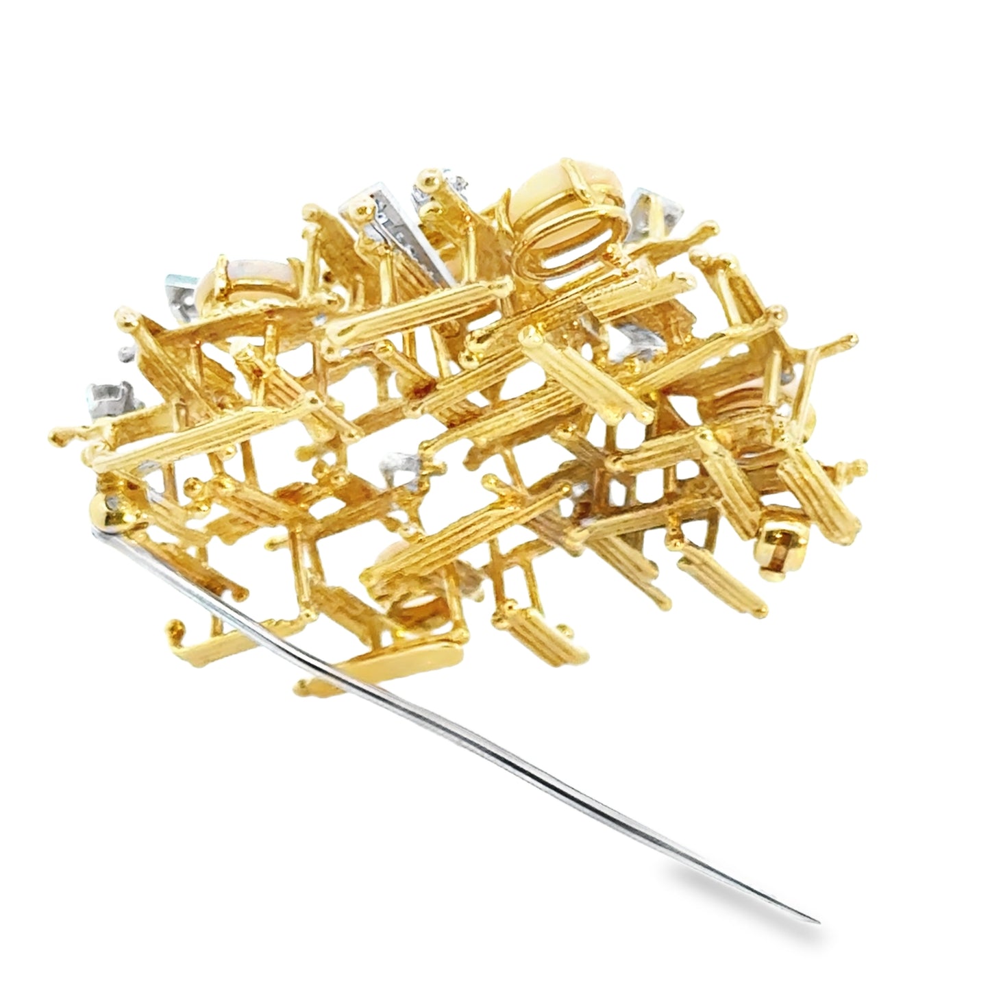 This is a striking 18k yellow gold brooch featuring a bold and intricate openwork design. The brooch is crafted with a textured gold lattice structure, giving it a contemporary and sculptural appearance. Embedded within the design are oval-shaped pink coral cabochons, adding a soft and organic contrast to the gold’s warm tone. Scattered throughout the piece are sparkling white diamonds set in white gold accents, enhancing the luxurious feel of the brooch and adding brilliance to the overall composition.