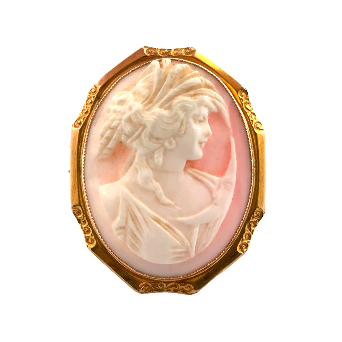This exquisite 1900s cameo brooch/pendant is crafted from 10k yellow gold and features a delicately hand-carved shell cameo of a classical female figure with ornate, flowing hair adorned with feathers. The cameo is framed by an intricately detailed octagonal gold bezel, which adds an elegant, vintage charm to the piece. The reverse side is equipped with a pin mechanism for use as a brooch and a loop for versatility as a pendant. This antique piece reflects the fine artistry and craftsmanship typical of early 20th-century jewelry, making it a timeless and collectible heirloom.