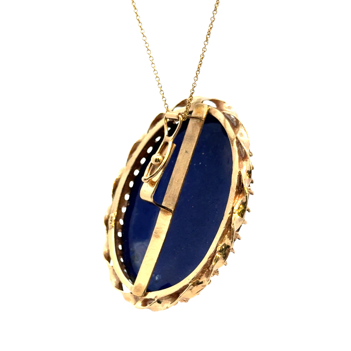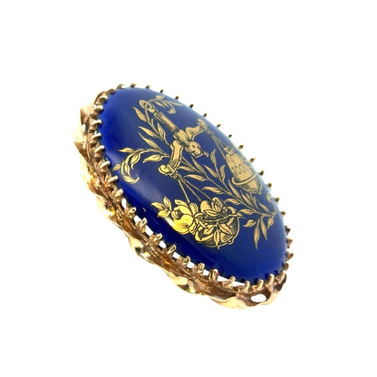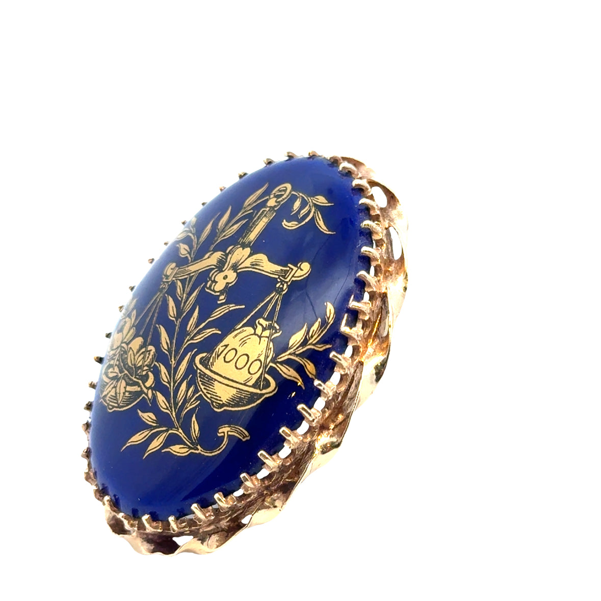 This exquisite 1930s pendant brooch features a richly detailed design crafted in 14K yellow gold with a vivid cobalt blue enamel and porcelain centerpiece. The oval plaque is adorned with a symbolic gold-tone illustration of a scale balancing a bouquet of flowers and a money bag marked “1000,” evoking themes of harmony between beauty and prosperity. Framed by an elegant scalloped gold border, this versatile piece includes both a pin and a bail, allowing it to be worn as either a brooch or a pendant. A unique and eye-catching collector’s item that celebrates vintage craftsmanship with character and charm.