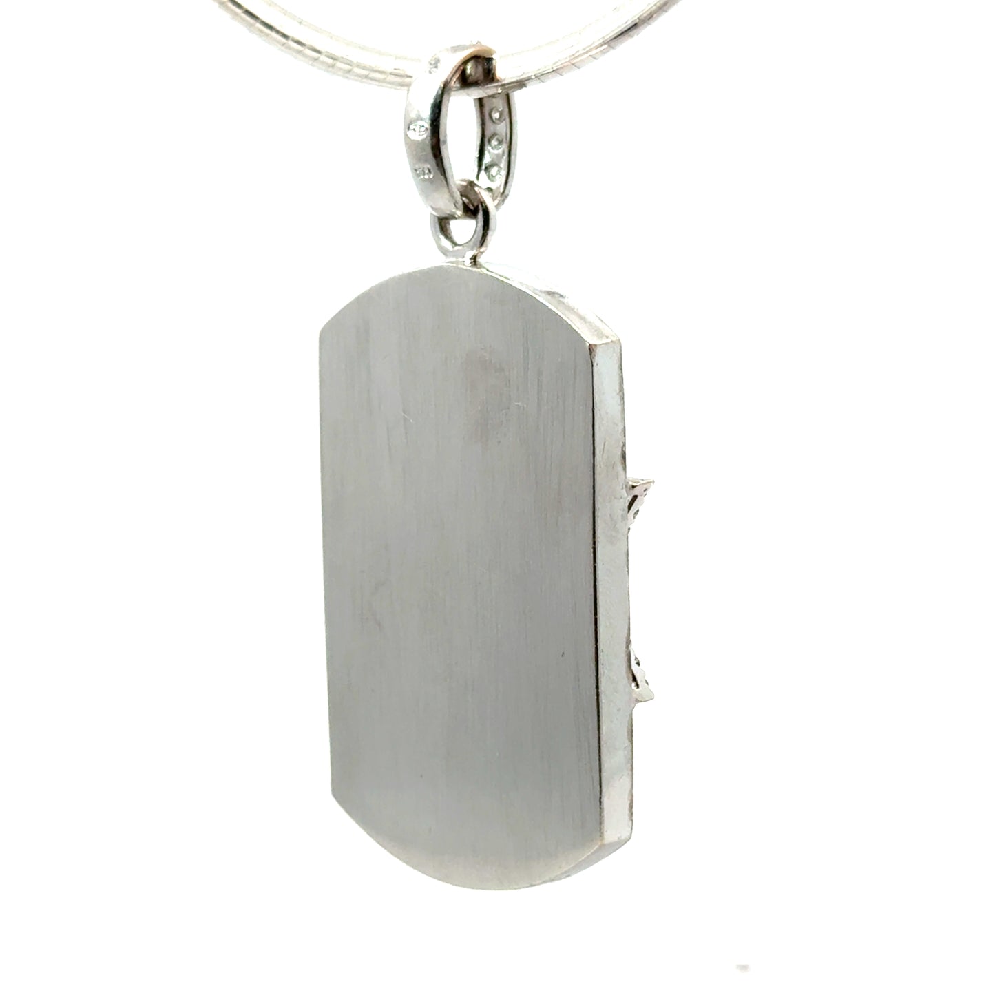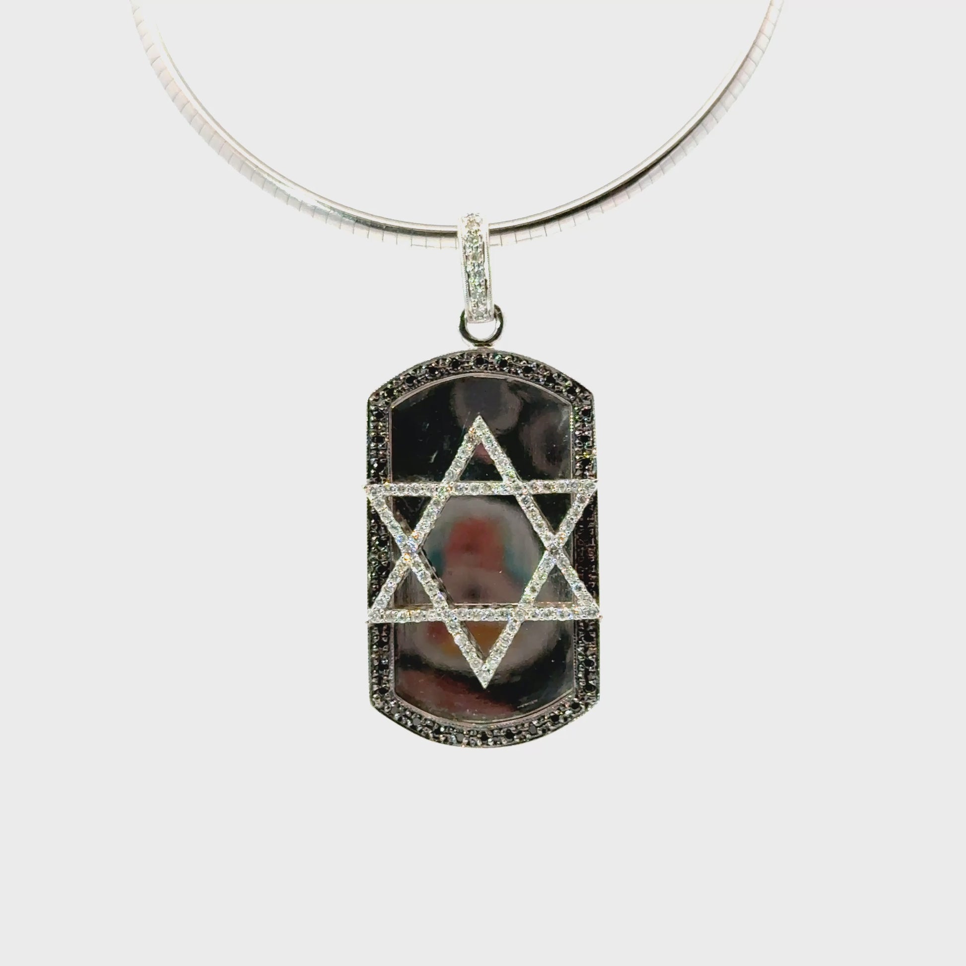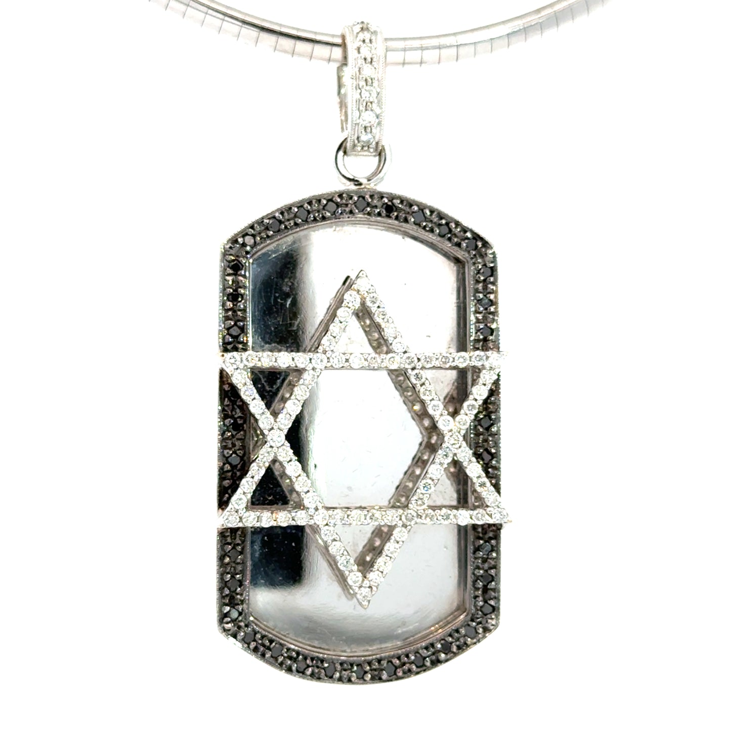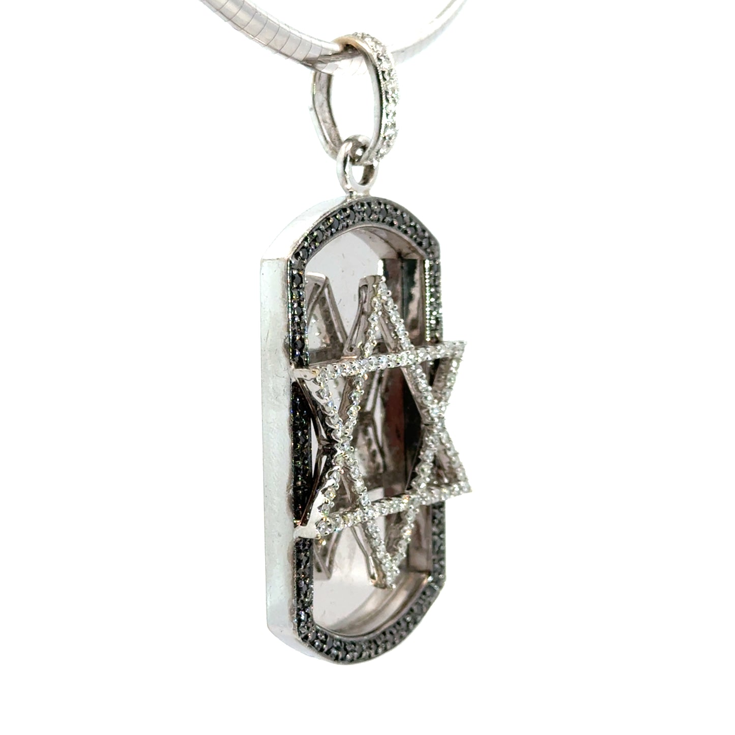 Elegant and symbolic, this 18K white gold pendant features a raised Star of David design set with brilliant-cut white diamonds. The polished/mirrored dog tag-style base is framed with shimmering black diamonds, creating bold contrast and visual depth. A diamond-set bail adds extra sparkle to this meaningful piece. A powerful symbol of faith and protection, this pendant makes a striking statement worn alone or layered.