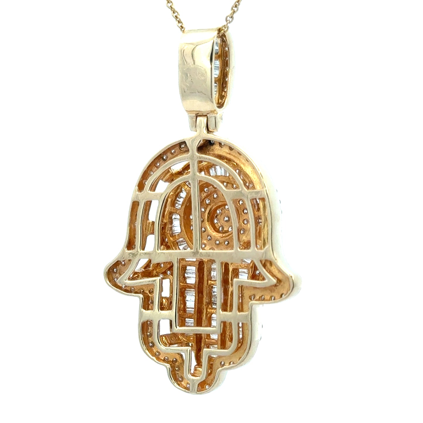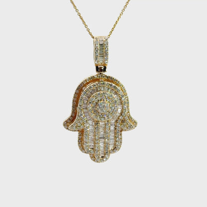 This stunning 14K yellow gold Hamsa pendant is a timeless symbol of protection and good fortune, beautifully crafted and set with high-quality natural diamonds in both round brilliant and baguette cuts. The diamonds are SI clarity and G color, offering exceptional sparkle and elegance. Intricately designed with a dimensional profile and open gallery back, this pendant is as detailed as it is radiant. Measuring approximately 2.0” including the bail (chain not included), it makes a meaningful and luxurious statement piece, perfect as a gift or a striking addition to your personal jewelry collection.