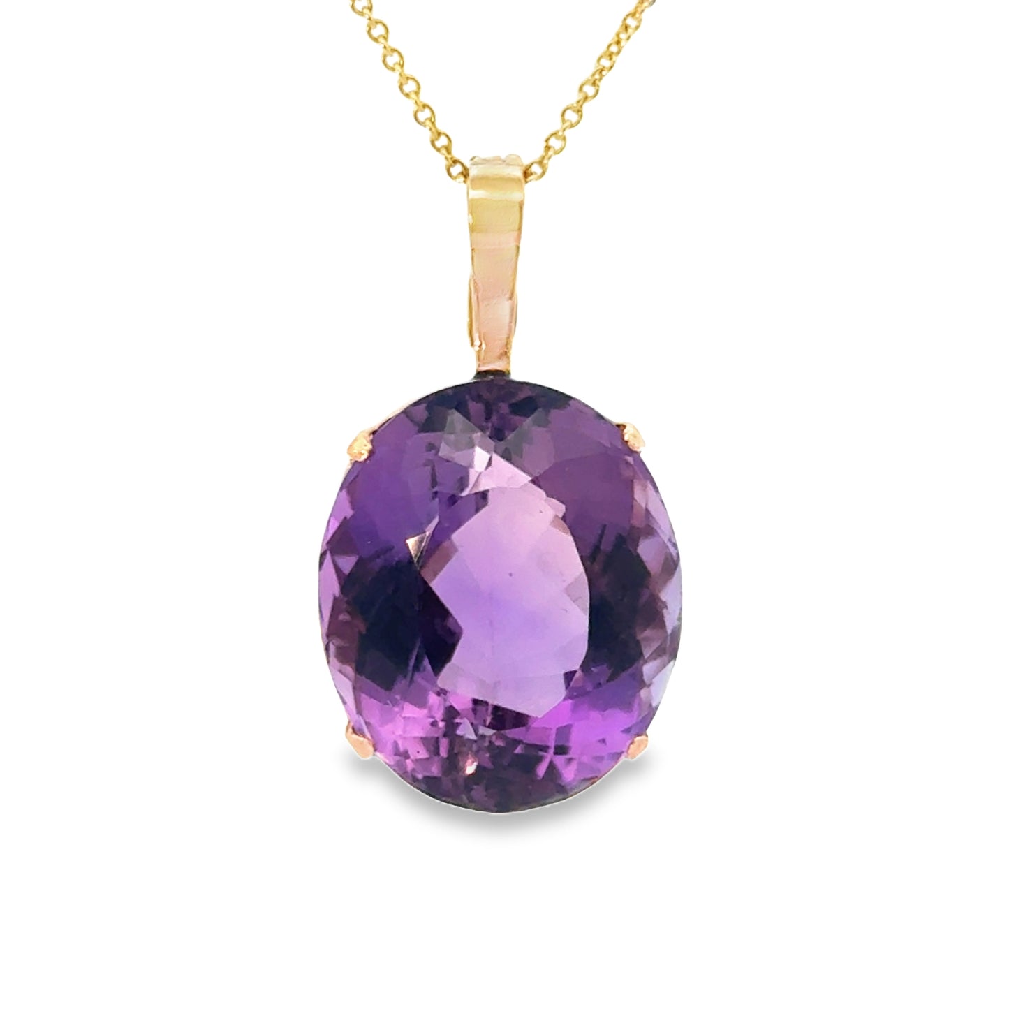 This elegant pendant from the 1960s is crafted from 14k rose gold and showcases a stunning, richly hued oval-cut amethyst as its centerpiece. The amethyst is held securely by four prongs and set within an ornate filigree basket, featuring intricate, swirling patterns characteristic of vintage designs. The delicate filigree work enhances the pendant’s romantic, antique aesthetic, allowing light to pass through and illuminate the gemstones vibrant purple tones.