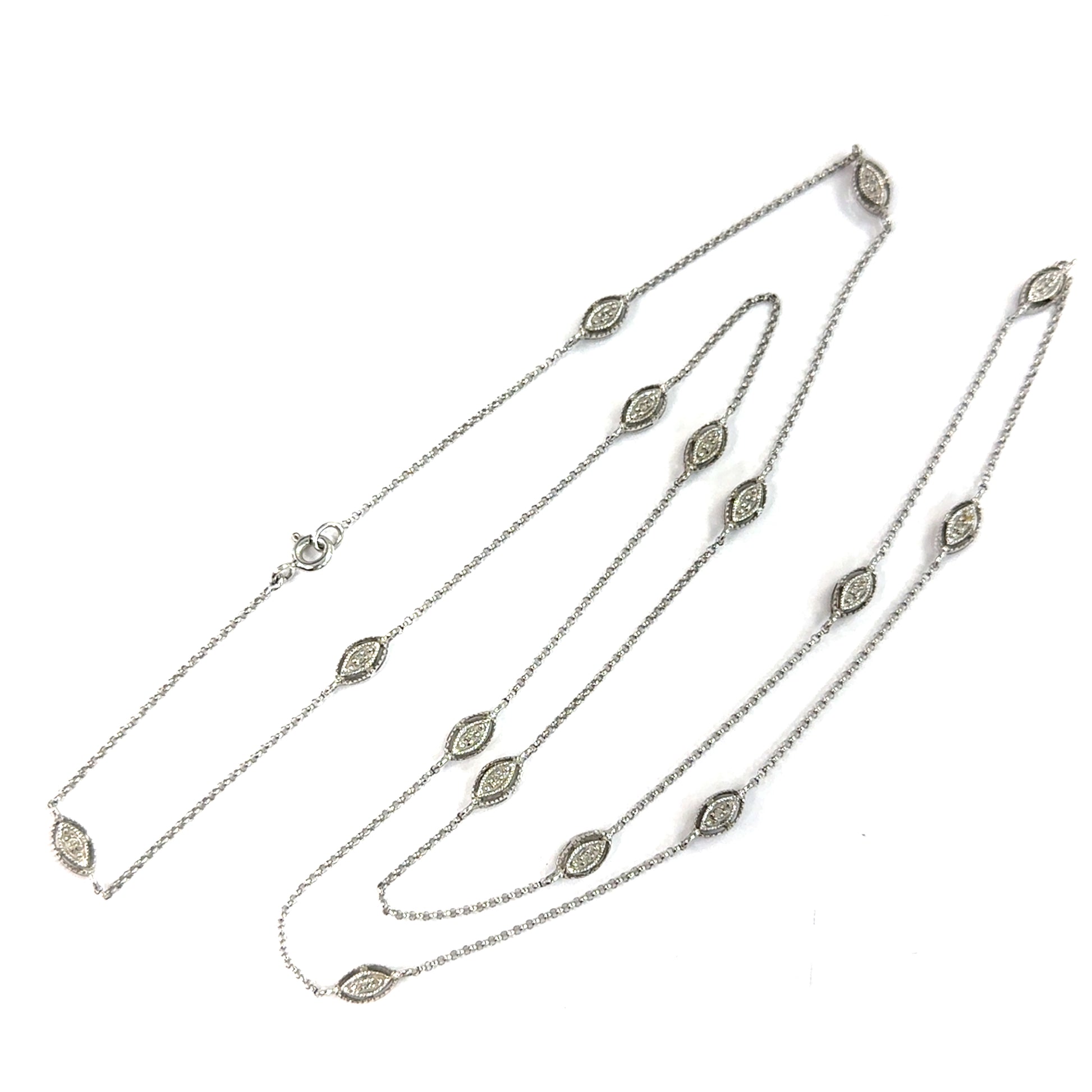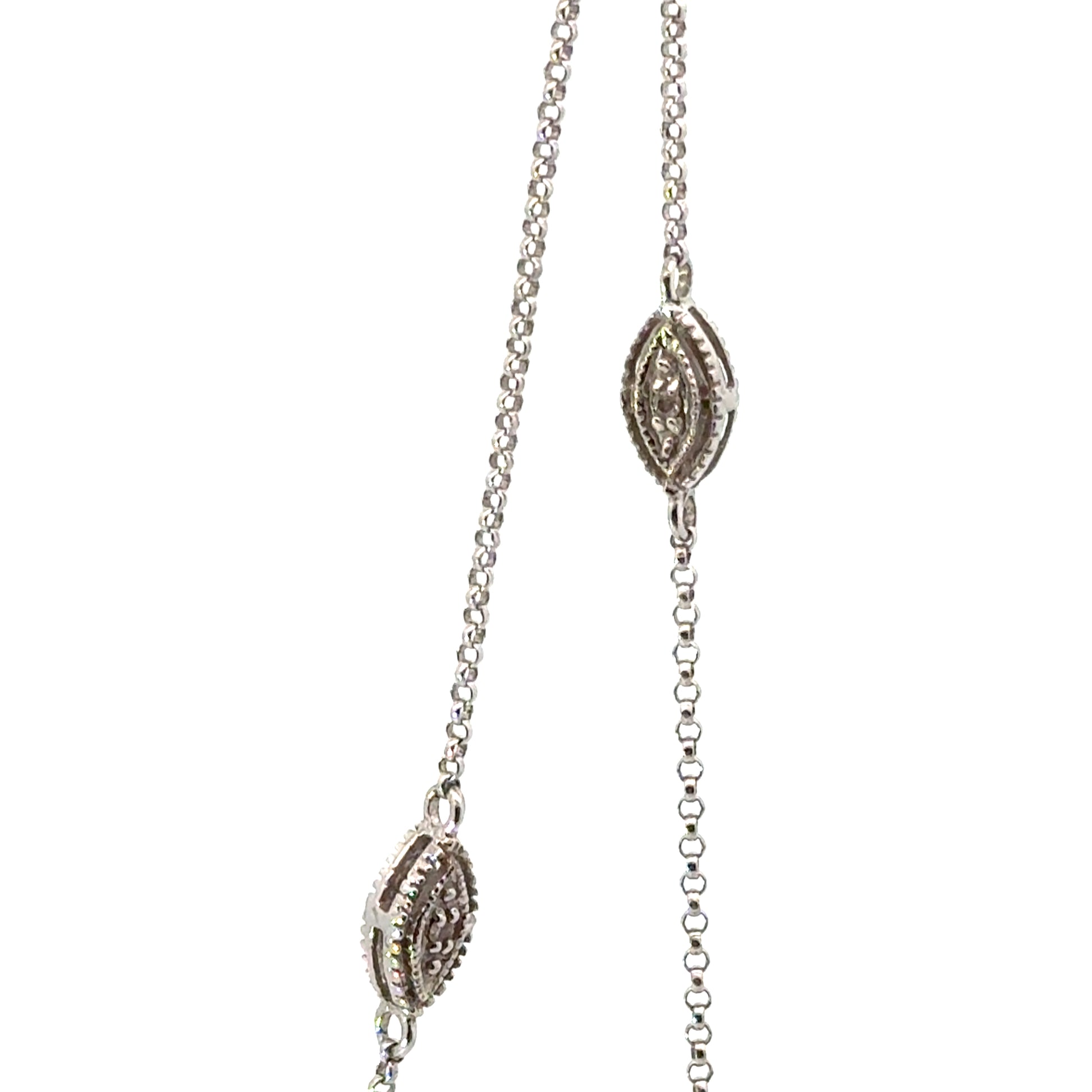 Sophisticated and timeless, this 14K white gold necklace is designed in a classic by-the-yard style, featuring bezel-set diamond stations evenly spaced along a 28-inch chain. Each marquise-shaped station is accented with sparkling diamonds framed by fine milgrain detailing, adding a touch of vintage-inspired elegance. The long length allows it to be worn as a single strand for a refined look or doubled for a chic layered effect.