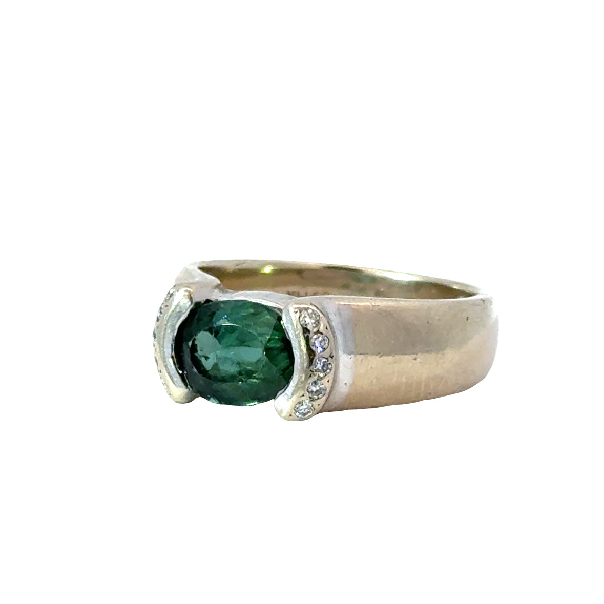 Modern, sculptural, and full of rich color, this 14K white gold ring features a striking approx. 2.0ct green tourmaline set in a sleek, contemporary bypass-style design. The oval tourmaline sits nestled between two curved gold arms, each lined with approx. 0.10ct of sparkling diamonds, adding a refined touch of brilliance that enhances the gem’s deep forest-green hue.
