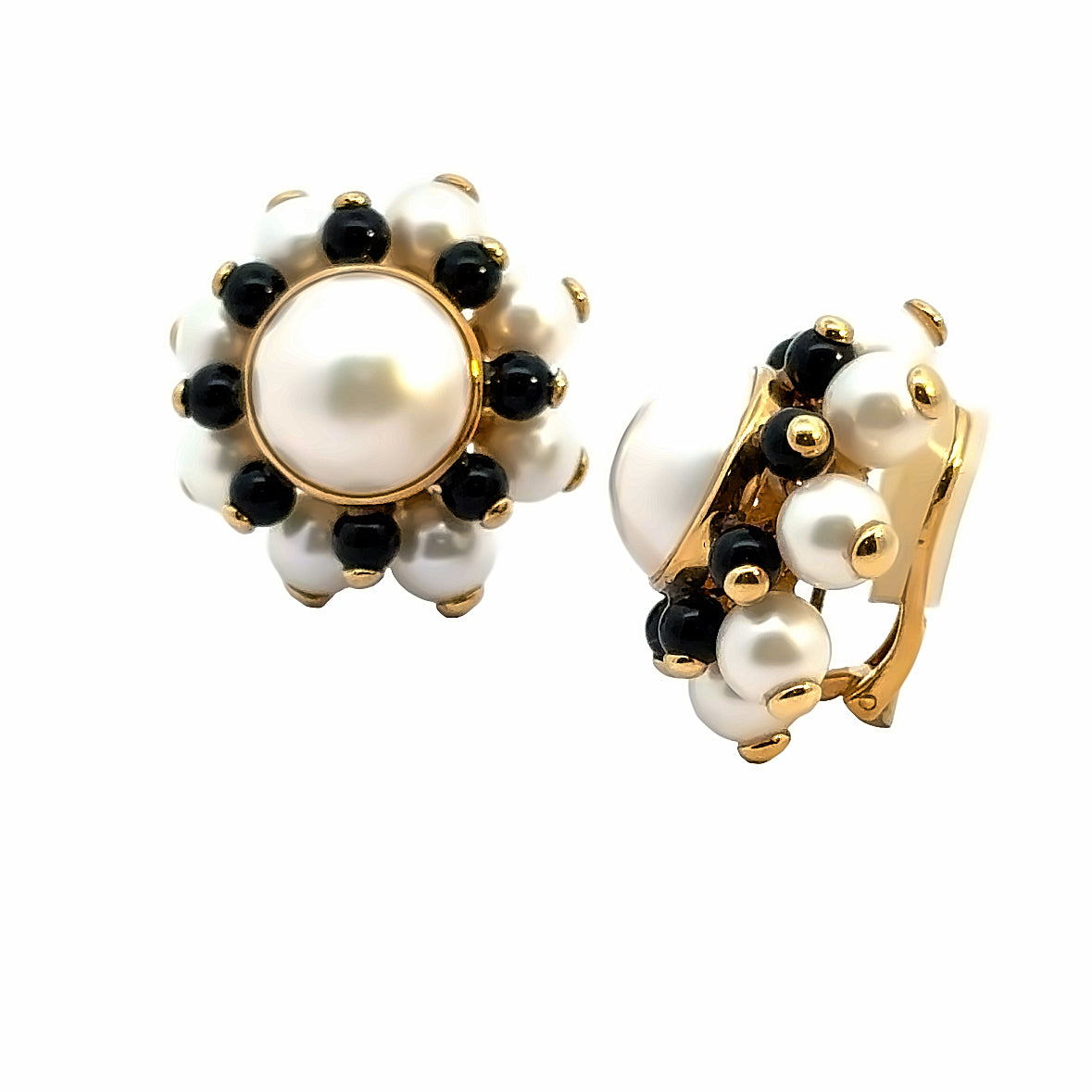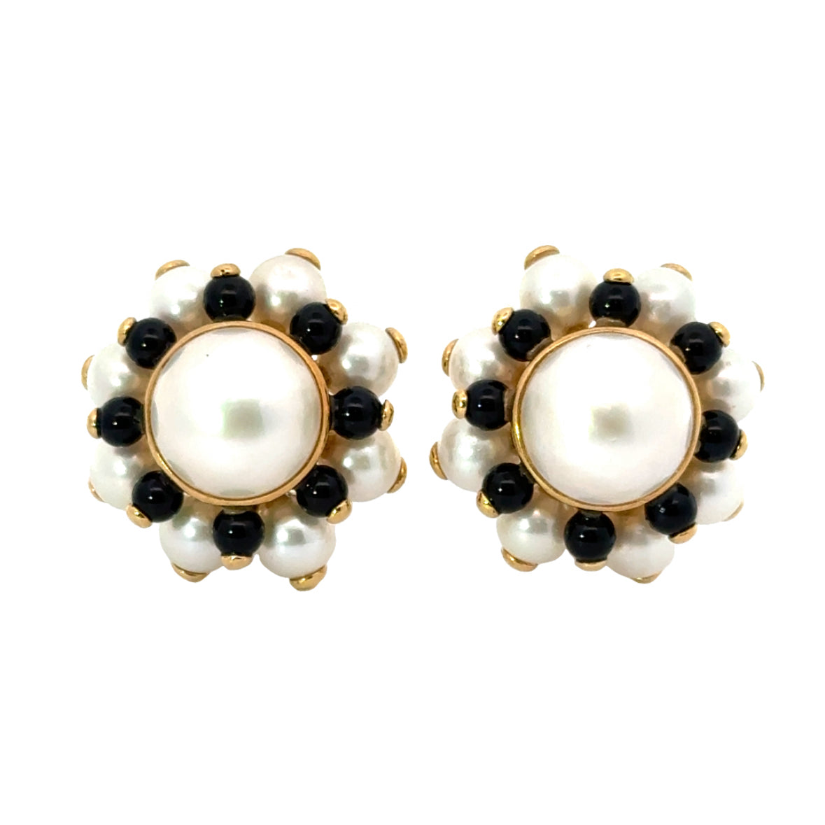 18K Yellow Gold Pearl & Onyx Flower Clip-On Earrings