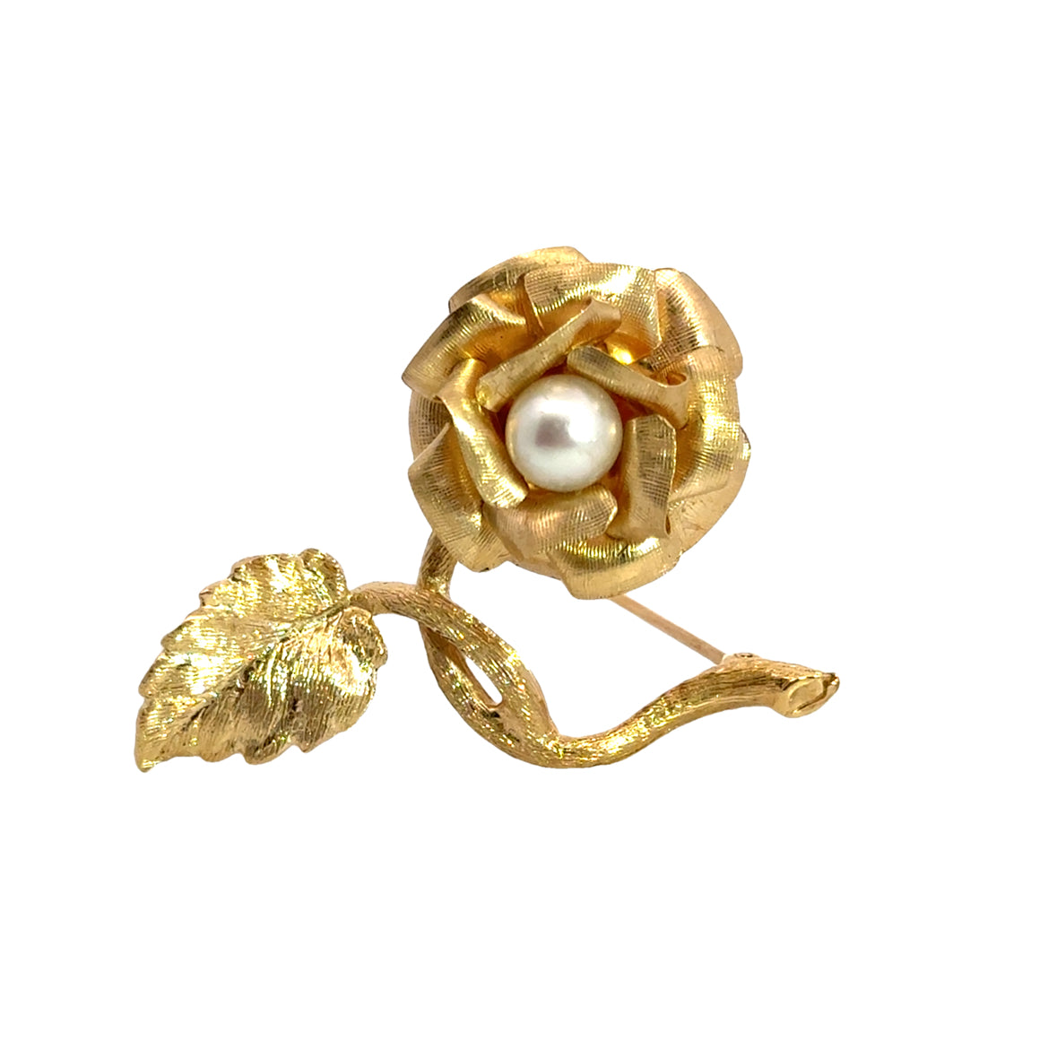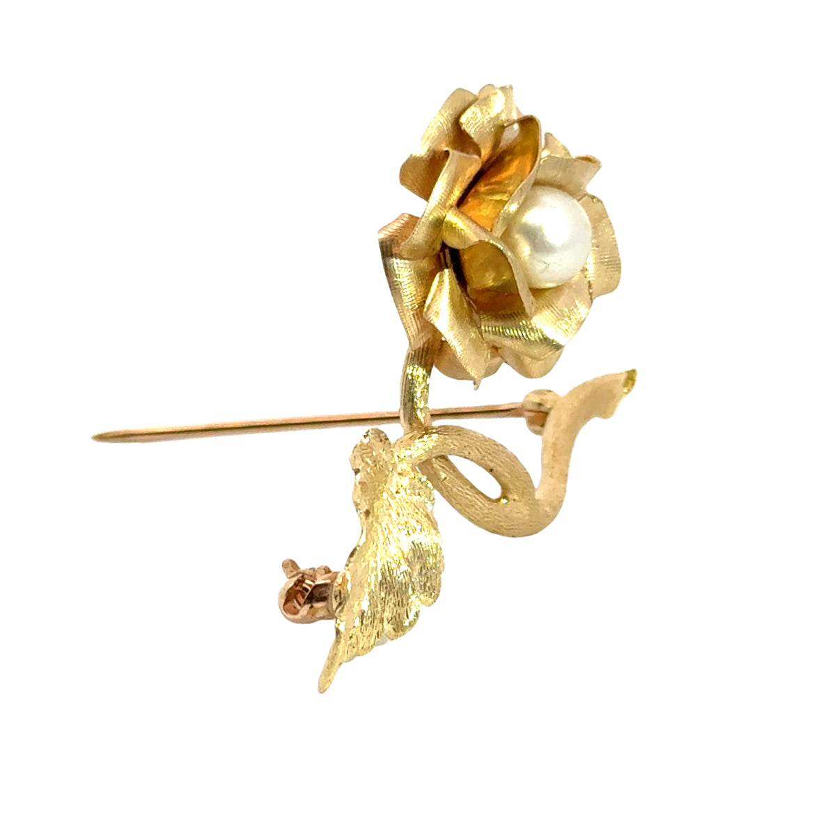This is a 14k yellow gold pearl brooch designed in the form of a rose. The brooch features a beautifully detailed gold sculpted rose with delicately folded petals, giving it a lifelike appearance. Nestled in the center of the rose is a single lustrous white pearl, symbolizing elegance and timeless beauty. The textured gold leaf and stem further enhance the botanical motif, adding depth and dimension to the design. The brooch’s craftsmanship highlights its vintage charm, making it a classic and versatile accessory. Perfect for collectors or admirers of floral-inspired jewelry, this brooch combines nature’s beauty with refined artistry.