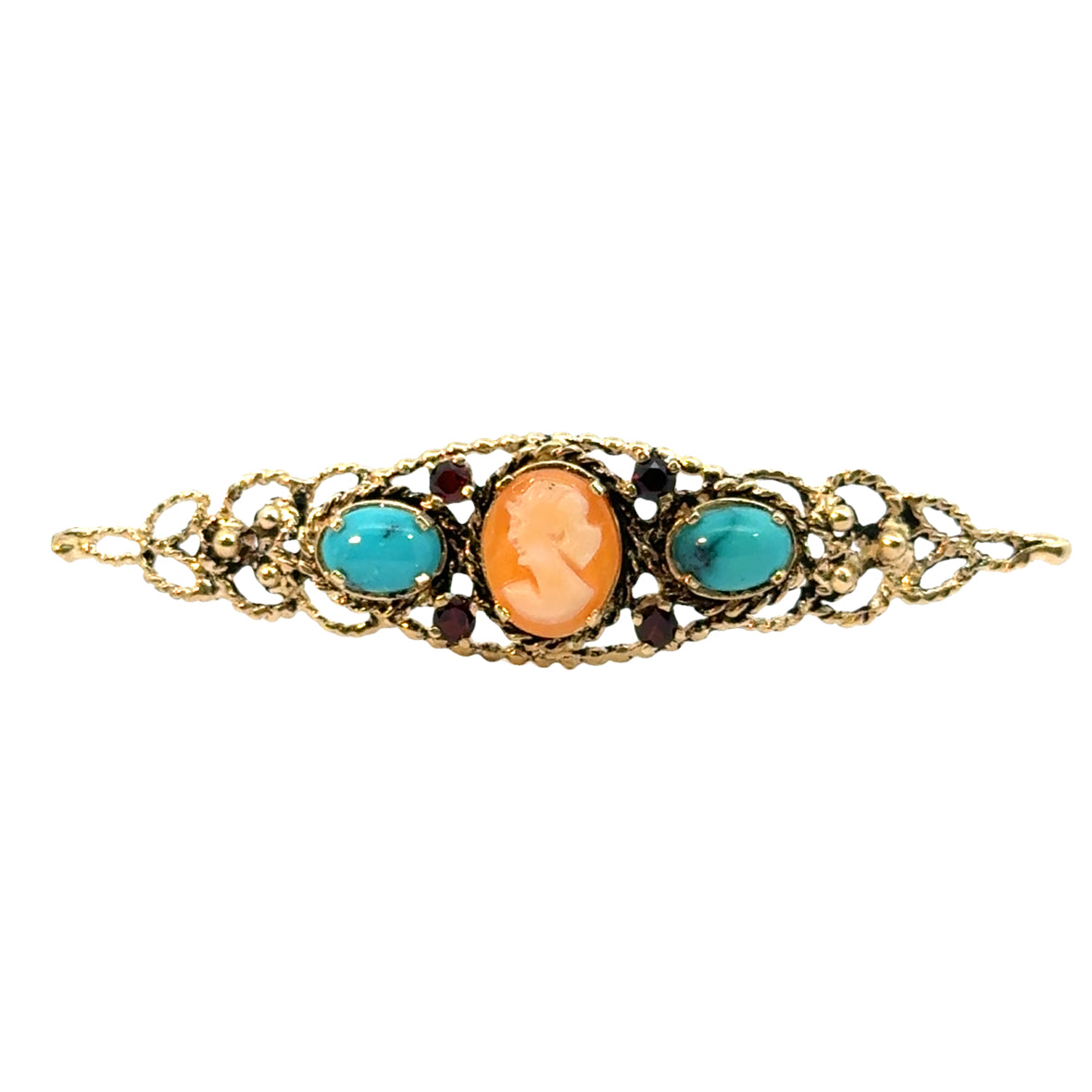 This exquisite 1950s cameo brooch is crafted in 14k yellow gold with intricate filigree detailing, reflecting the elegant vintage style of the mid-20th century. At its center is a finely carved shell cameo featuring a classic profile of a woman’s silhouette, set within a delicate gold frame. Flanking the cameo are two vibrant turquoise cabochons, which add a striking pop of blue color and complement the warm tones of the gold. Small, deep red garnet accents surround the central elements, creating a harmonious balance of colors and enhancing the brooch’s ornate appearance. The combination of the detailed craftsmanship, carefully selected stones, and timeless design makes this piece a stunning and sophisticated representation of vintage jewelry.
