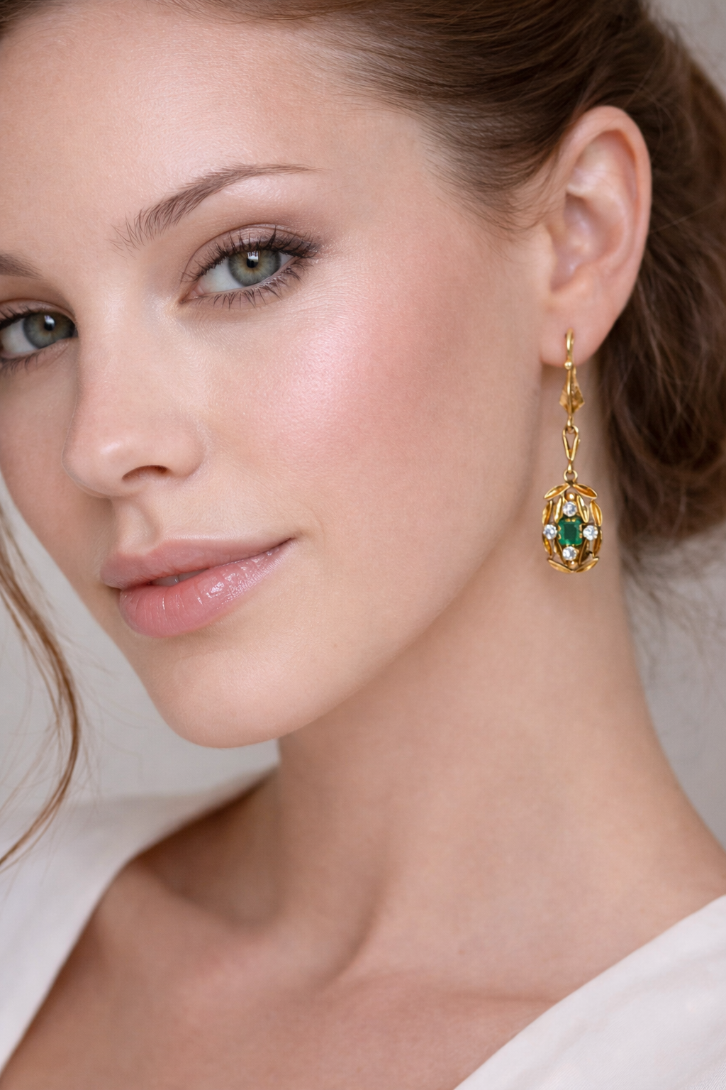 The emerald sits proudly at the center, accented by four white stones in a classic floral arrangement. The elongated drop design creates elegant movement, while the intricate gold work adds depth and texture — characteristic of late 19th to early 20th century styling.