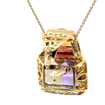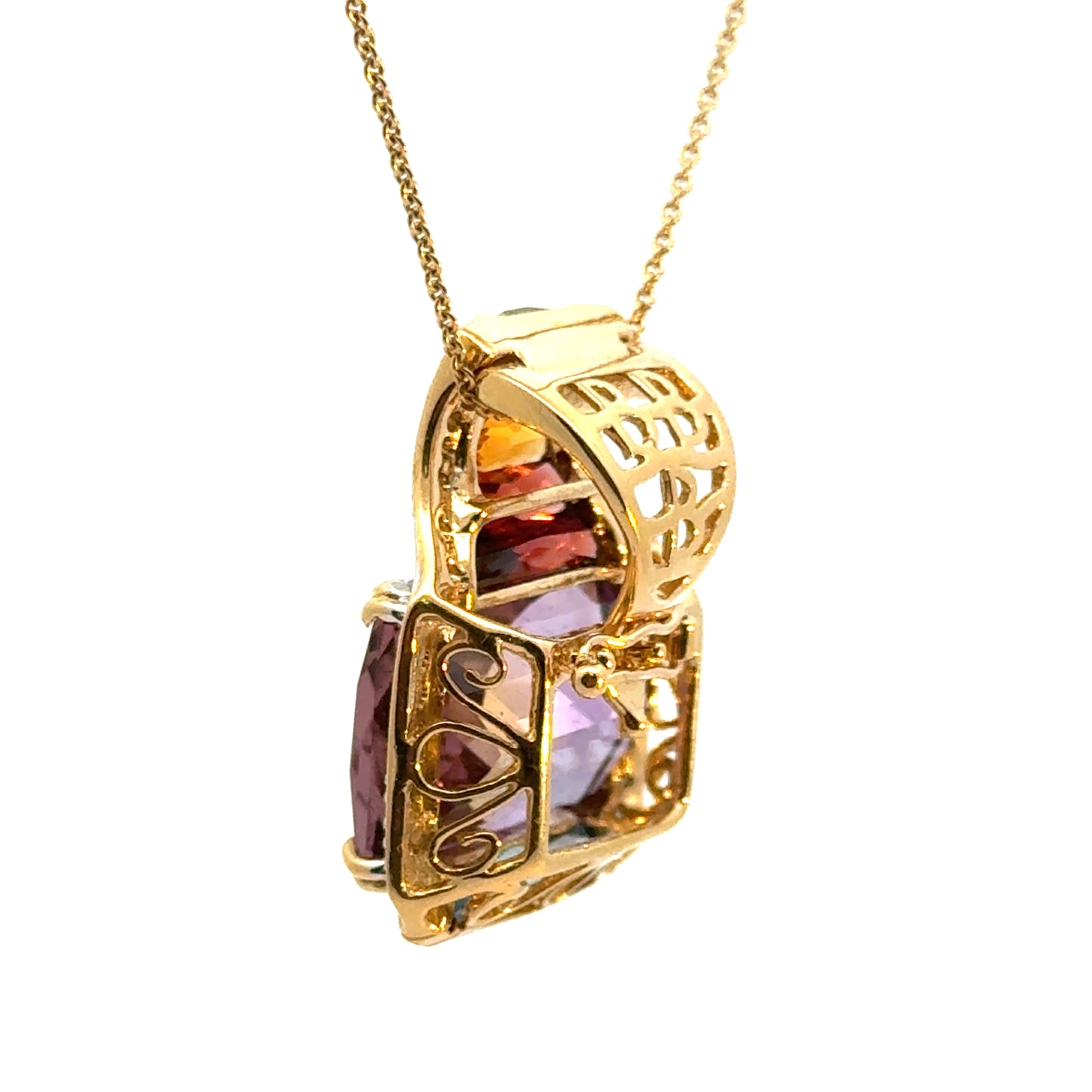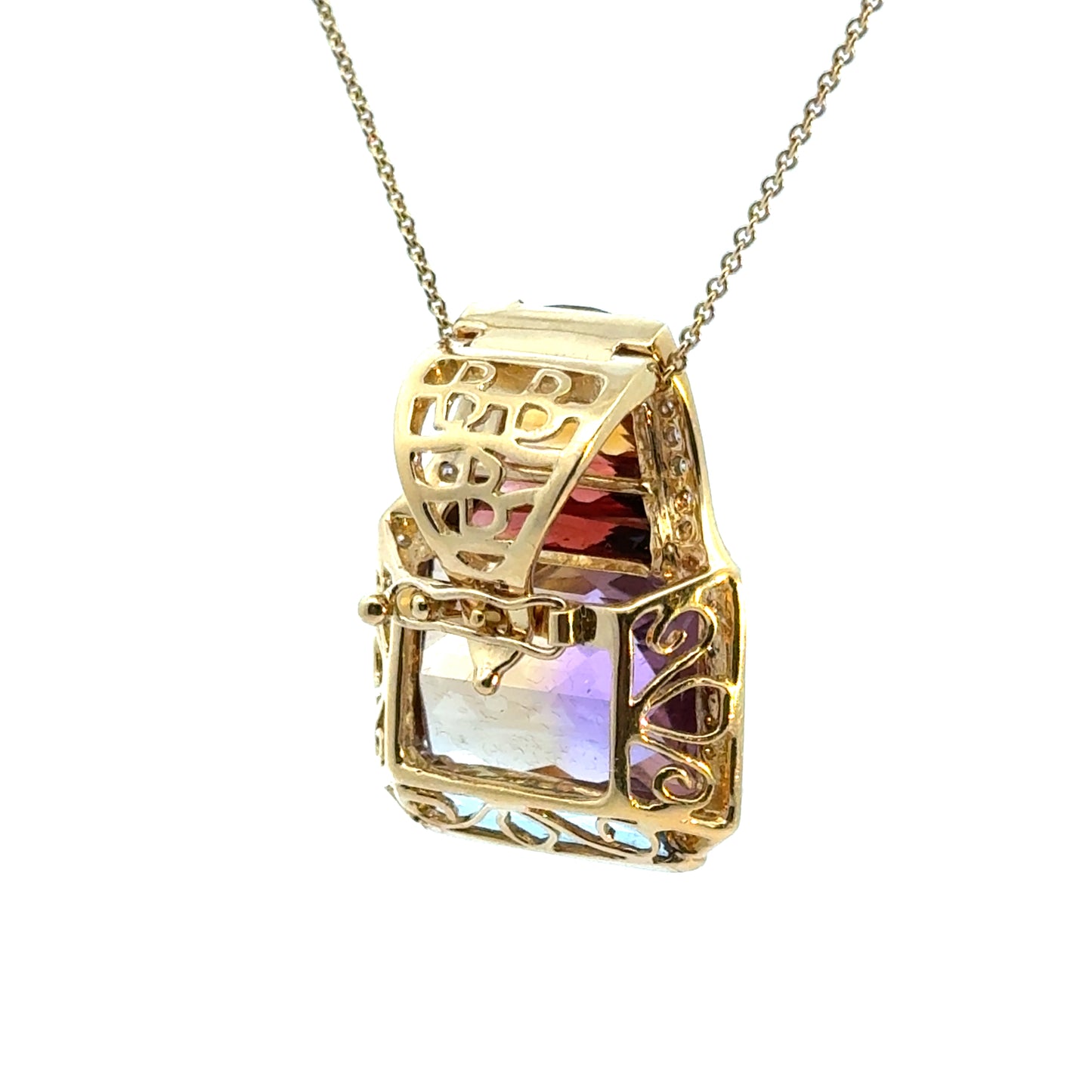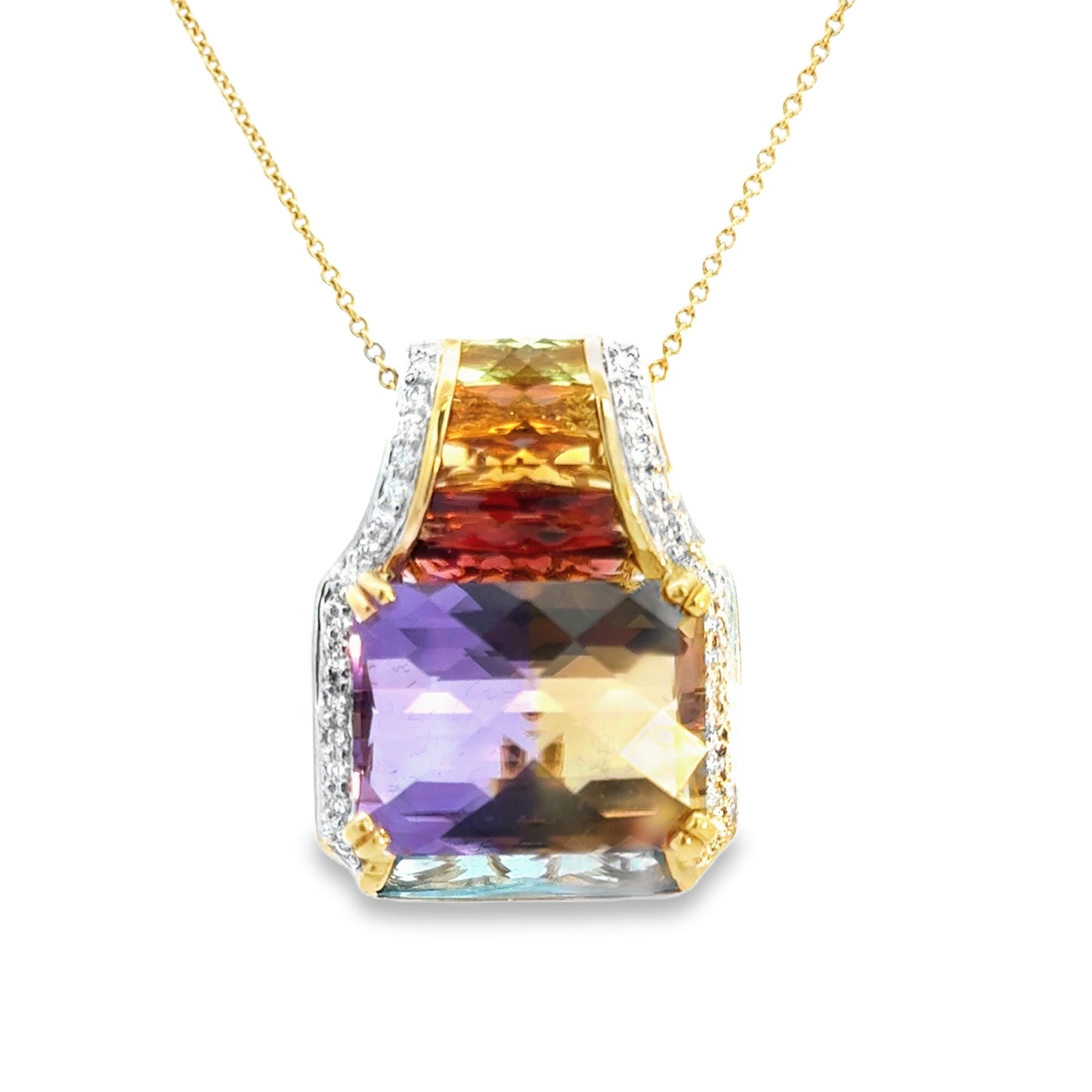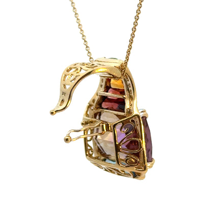 This captivating 18k yellow gold enhancer pendant features a richly faceted, multi-color tourmaline as its centerpiece, transitioning from deep amethyst to golden amber hues. Framed with a shimmering row of white diamonds on either side, the piece combines vibrant color with refined sparkle. The intricate gallery and openwork enhancer bail offer both visual interest and versatility—allowing it to be worn on a chain or clipped onto pearls or beads. A hidden clasp mechanism secures the pendant in place, making it a true statement of elegance, craftsmanship, and function. Stamped 18k. Chain not included.