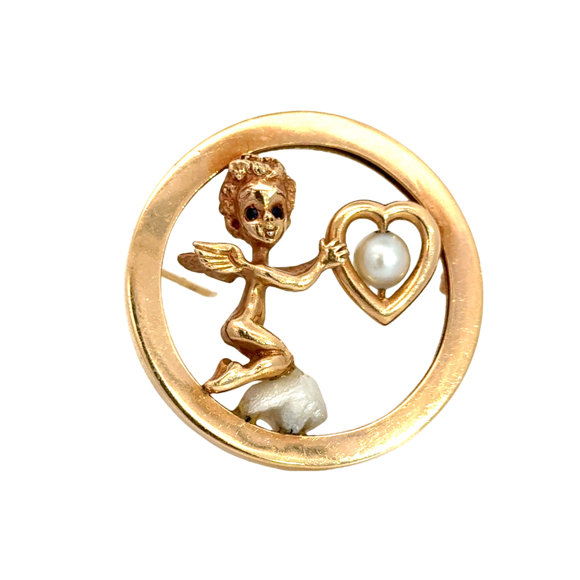 This 14k yellow gold and natural pearl brooch features a whimsical and artistic design. At its center, a finely crafted cherub or cupid figure with outstretched wings reaches for a heart-shaped motif holding a luminous natural pearl. The cherub’s detailed facial expression and posture convey a sense of playfulness and romance, enhancing the sentimental appeal of the piece. The brooch is enclosed within a smooth, circular gold frame that creates a harmonious composition. The natural pearl, set delicately within the heart, exudes an organic, soft luster, adding elegance to the design. The cherub kneels atop a textured baroque pearl, enhancing the brooch’s artistic and vintage charm. This piece dates to the mid-20th century and beautifully captures themes of love and devotion, making it a perfect collector’s item or romantic gift.