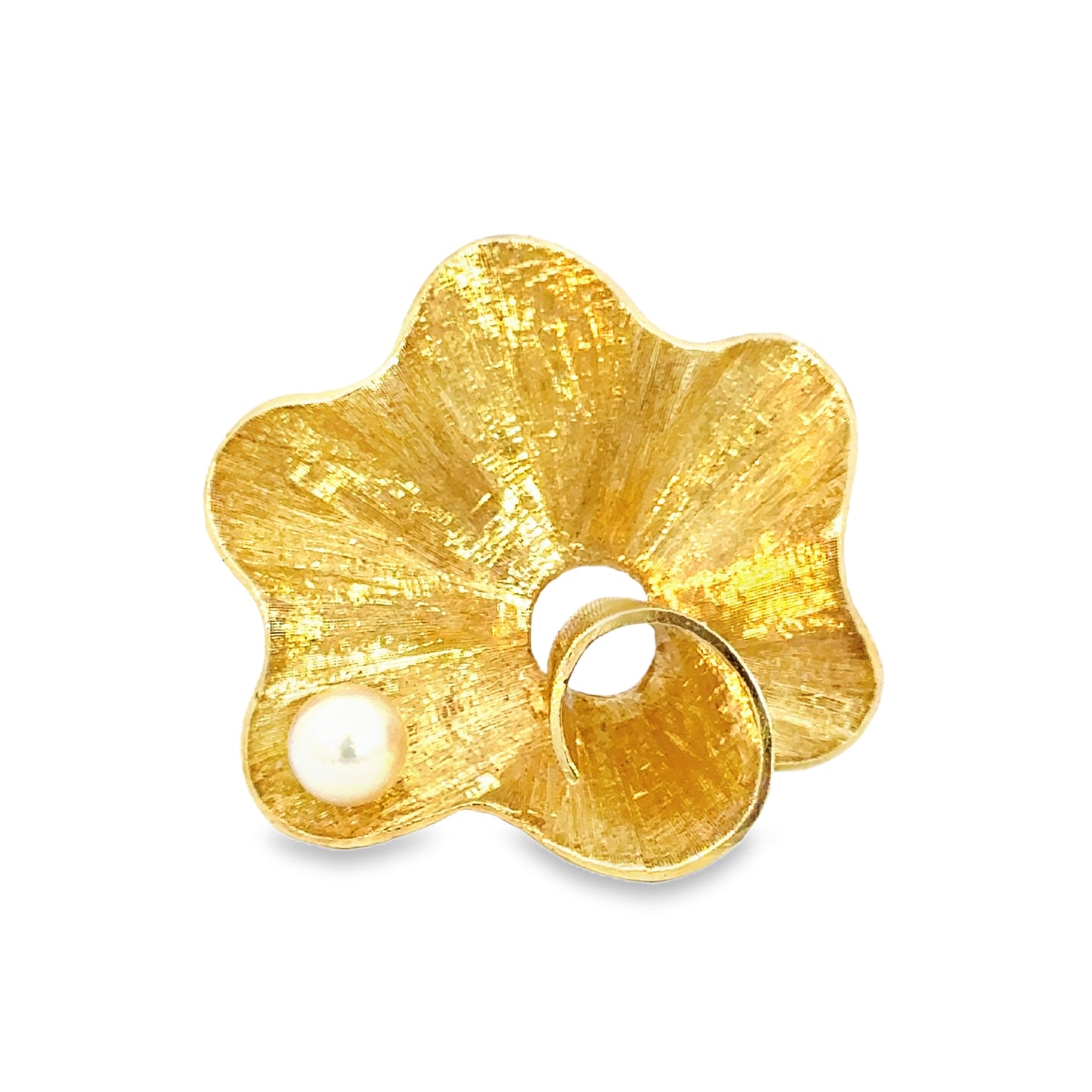 This 1980s brooch is a stunning example of vintage jewelry, crafted in 14k yellow gold with a distinctive shell motif that embodies both elegance and organic beauty. The design features a textured, flowing form reminiscent of a seashell, enhanced by a lustrous pearl accent nestled within the folds, evoking the imagery of a precious find from the sea. The layered and sculptural structure gives the brooch a dynamic, three-dimensional quality, with intricate detailing that highlights the craftsmanship of the era. Its smooth back and secure pin clasp make it both a functional and striking accessory, blending timeless luxury with natural inspiration.
