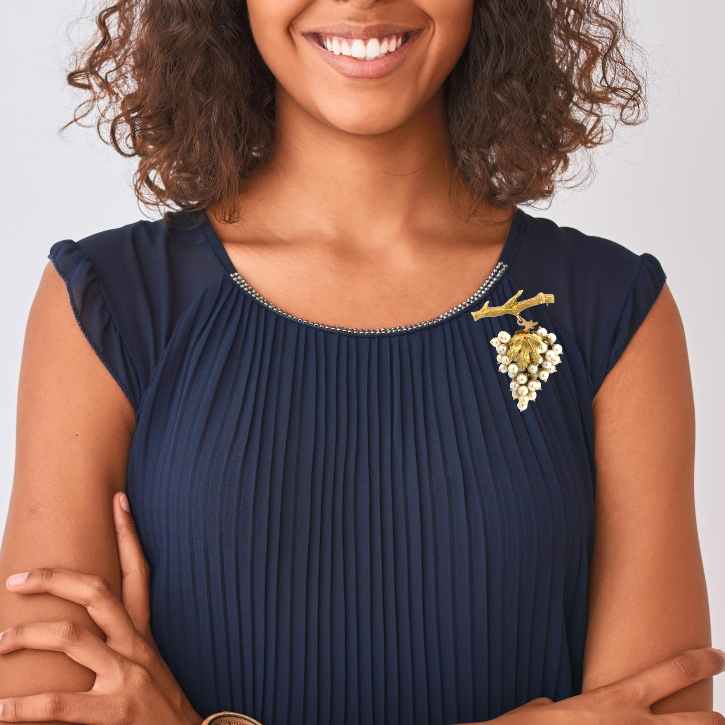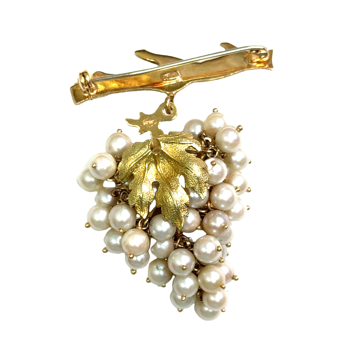 The craftsmanship reflects mid-century design sensibilities, focusing on organic and nature-inspired themes, with the use of rich, warm yellow gold that contrasts beautifully with the creamy-white pearls. The pearls vary slightly in size, arranged artfully to mimic natural grape clusters. This brooch combines timeless sophistication with a playful yet refined botanical charm, making it a remarkable vintage piece suitable for both formal and decorative wear.