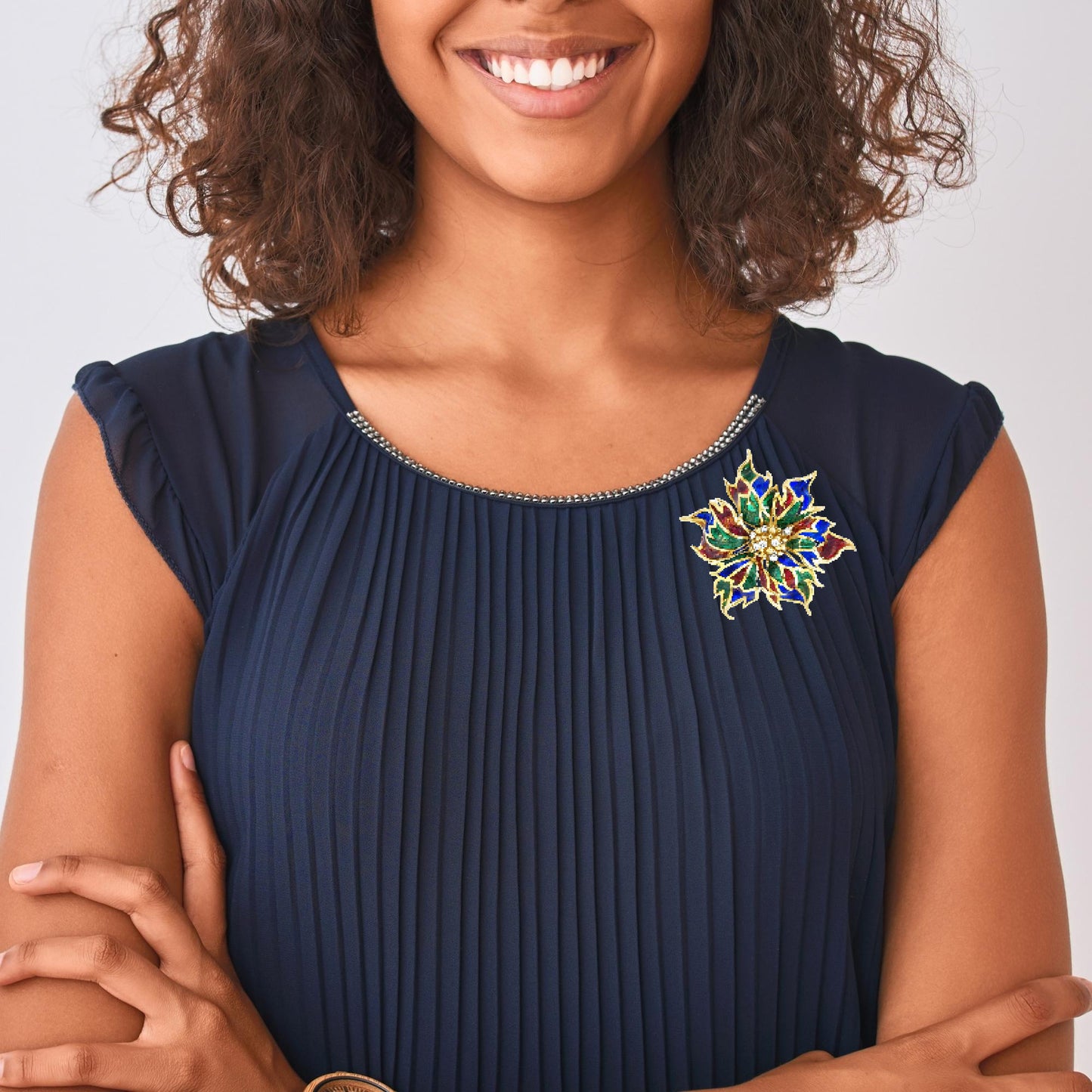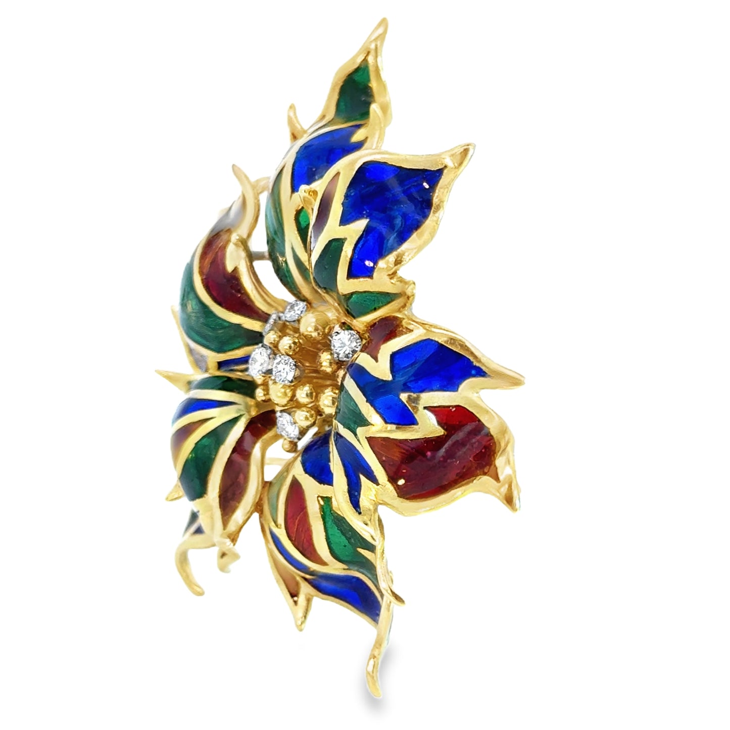 This exquisite vintage brooch from the 1950s is crafted in 18k yellow gold and showcases a vibrant floral design, potentially inspired by a poinsettia or hibiscus flower. The petals are adorned with rich, colorful enamel in striking shades of red, green, and blue, outlined with the elegance of gold detailing.