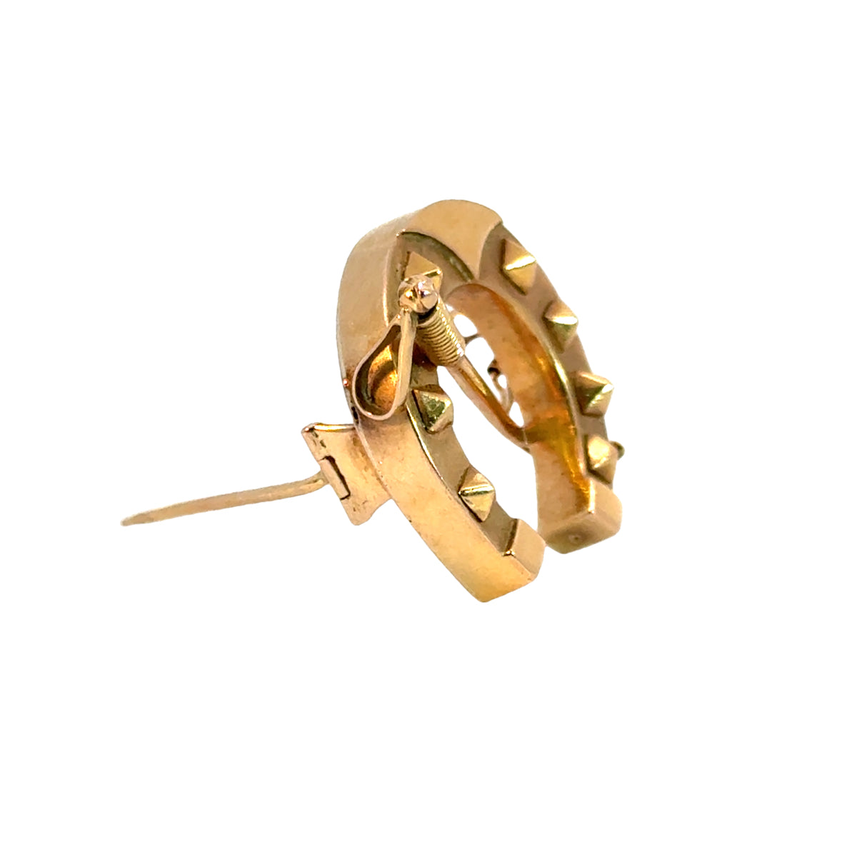 This is a retro-style brooch crafted from 18k yellow gold in the shape of a horseshoe. The brooch features raised pyramid-like studs along the surface, adding a bold and textured element typical of retro designs from the mid-20th century. A detailed bar with a coiled spring accent crosses the center of the horseshoe, resembling a riding or equestrian theme. The combination of the high-polish finish and intricate details gives this brooch a distinctive vintage charm. Its secure pin fastening ensures easy wear, making it a perfect accessory for lovers of both retro jewelry and symbolic designs like the lucky horseshoe.