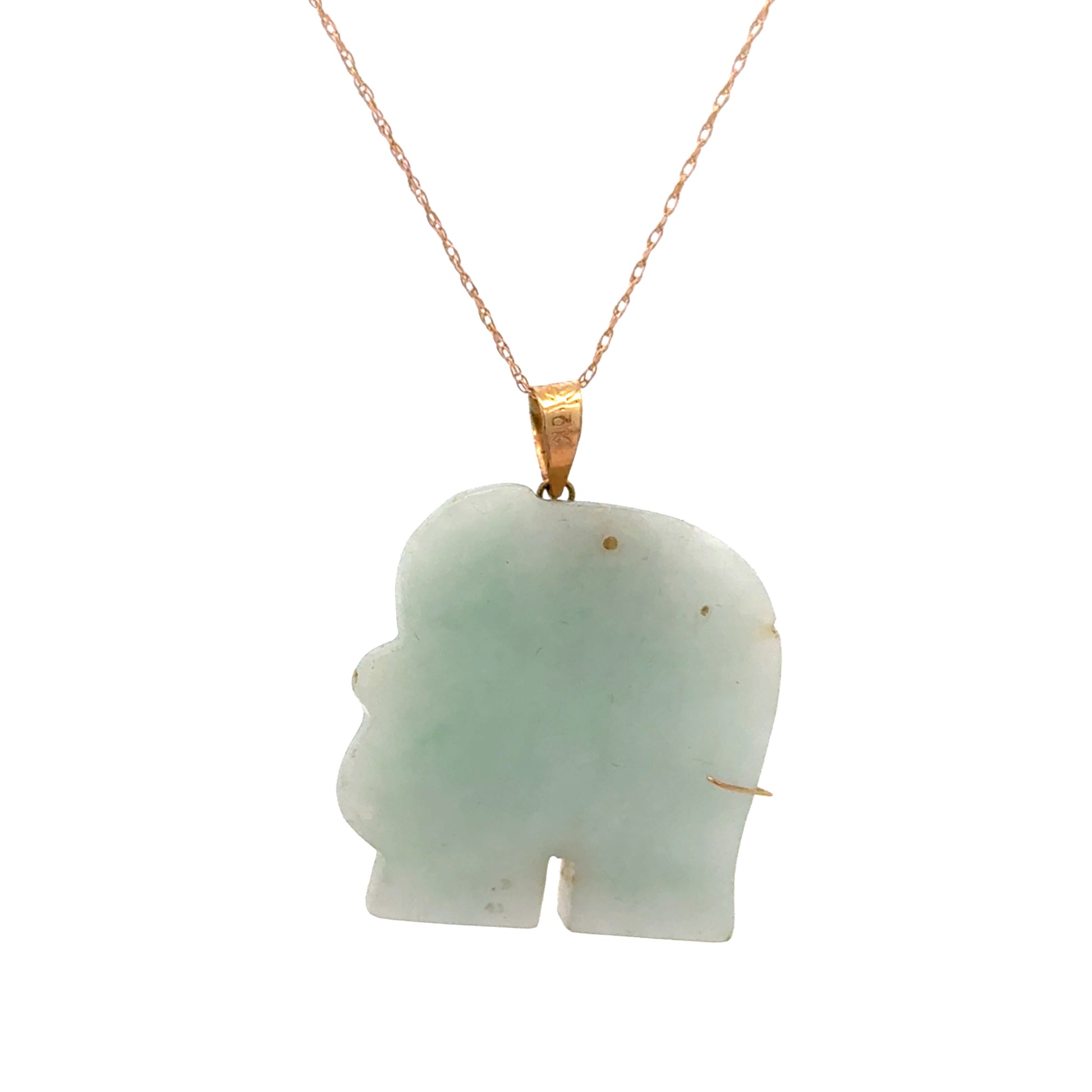 This beautiful estate pendant is crafted from light green jade, delicately carved in the shape of an elephant — a universal symbol of strength, wisdom, and good fortune. The jade is accented with 14K yellow gold details, including an ornate gold bail with intricate Chinese character design, giving the piece an elegant touch.