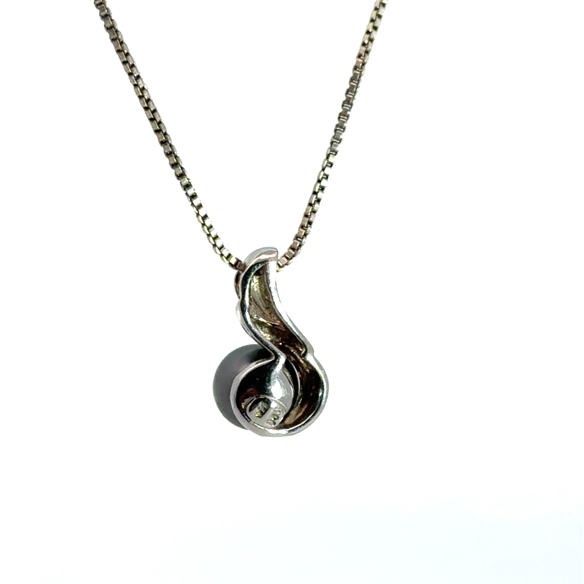 A striking blend of modern elegance and timeless sophistication, this pendant features a luminous black cultured pearl gracefully embraced by a fluid swirl of solid 14K white gold. The sleek design highlights the pearl’s rich luster, while the artistic setting adds a touch of contemporary flair.