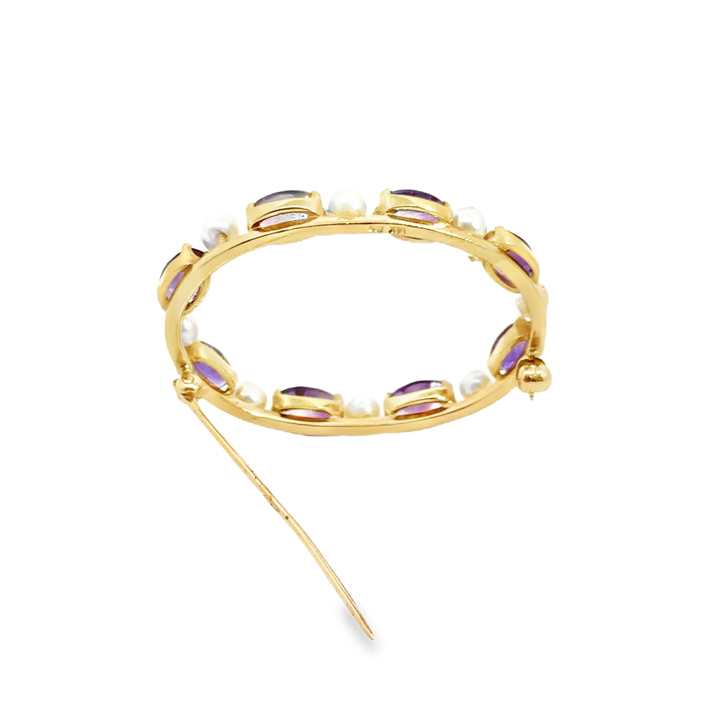 This stunning 1960s brooch is crafted in 14k yellow gold, featuring a radiant circle design adorned with alternating oval-cut amethysts and luminous cultured pearls. The rich purple hue of the amethysts contrasts beautifully with the creamy white pearls, creating a striking visual balance. Each gemstone is securely set in delicate prong settings, showcasing the era’s attention to detail and craftsmanship. The brooch is completed with a secure pin clasp, making it both a practical and elegant accessory. This vintage piece exemplifies timeless style and sophistication, perfect for adding a touch of color and luxury to any ensemble.