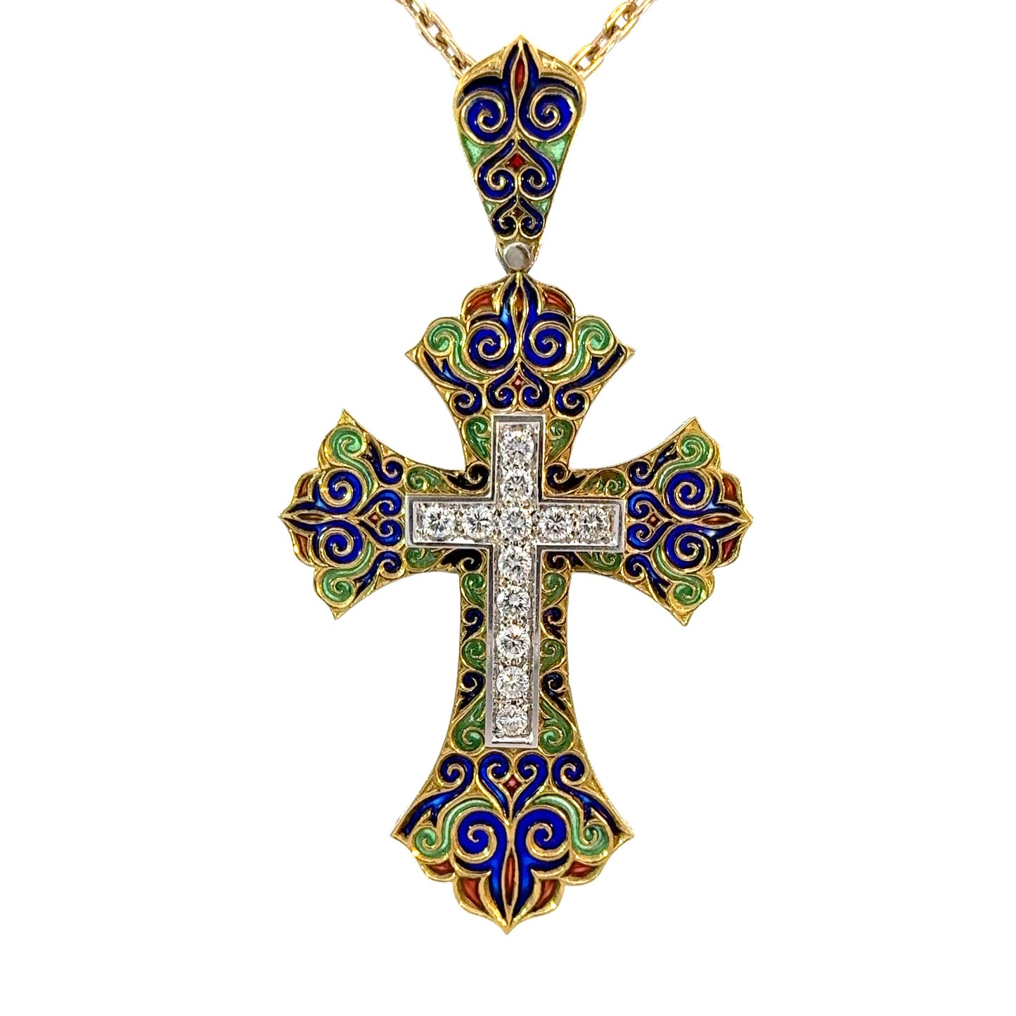 18K Yellow Gold Ornate Large Enamel & Diamond Cross