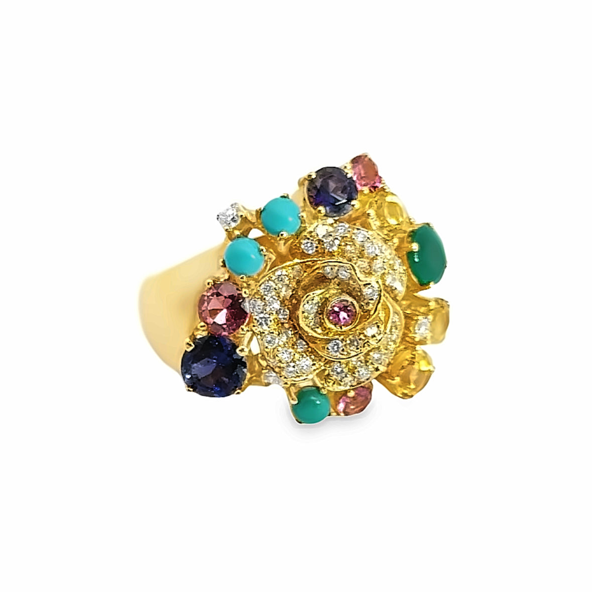Embrace sparkle and color with this charming 18K multi-color 1980's rose-design ring. A true gem that effortlessly embodies charm and invokes joys of the past and fun with every glance.
