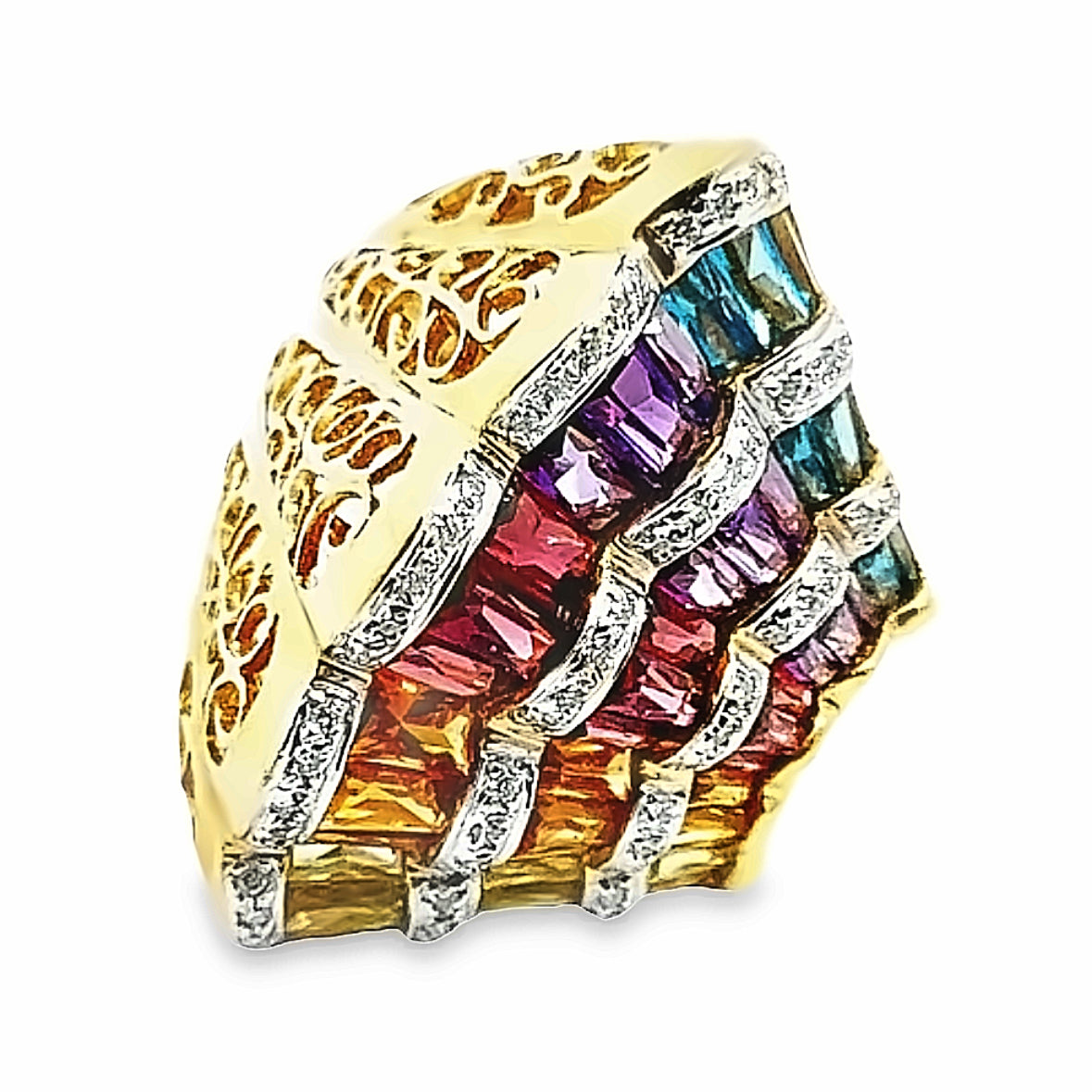 18K Breathtaking Radiant Multi-colored Rainbow Tourmaline and Diamond Ring, a true masterpiece that effortlessly mesmerizes. Depending on which way you look, it will captures your attention; one side colorful and eye catching, and one side an expression of delicate filigree. This ring is a true masterpiece that is bound to dazzle and enchant from every angle.