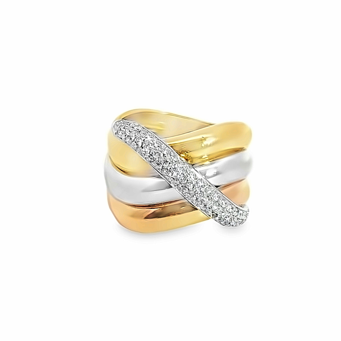This exquisite piece showcases a wide band of three rows of radiant 18K gold in the mesmerizing tricolor combination of white, yellow, and rose. The crossover diamond band with pave set diamonds creates and enchanting visual delight and creates elegance and playfulness. The art of trendy design is beautifully echoed in this gleaming piece that boasts femininity and charm and is perfectly elegant for all occasions.