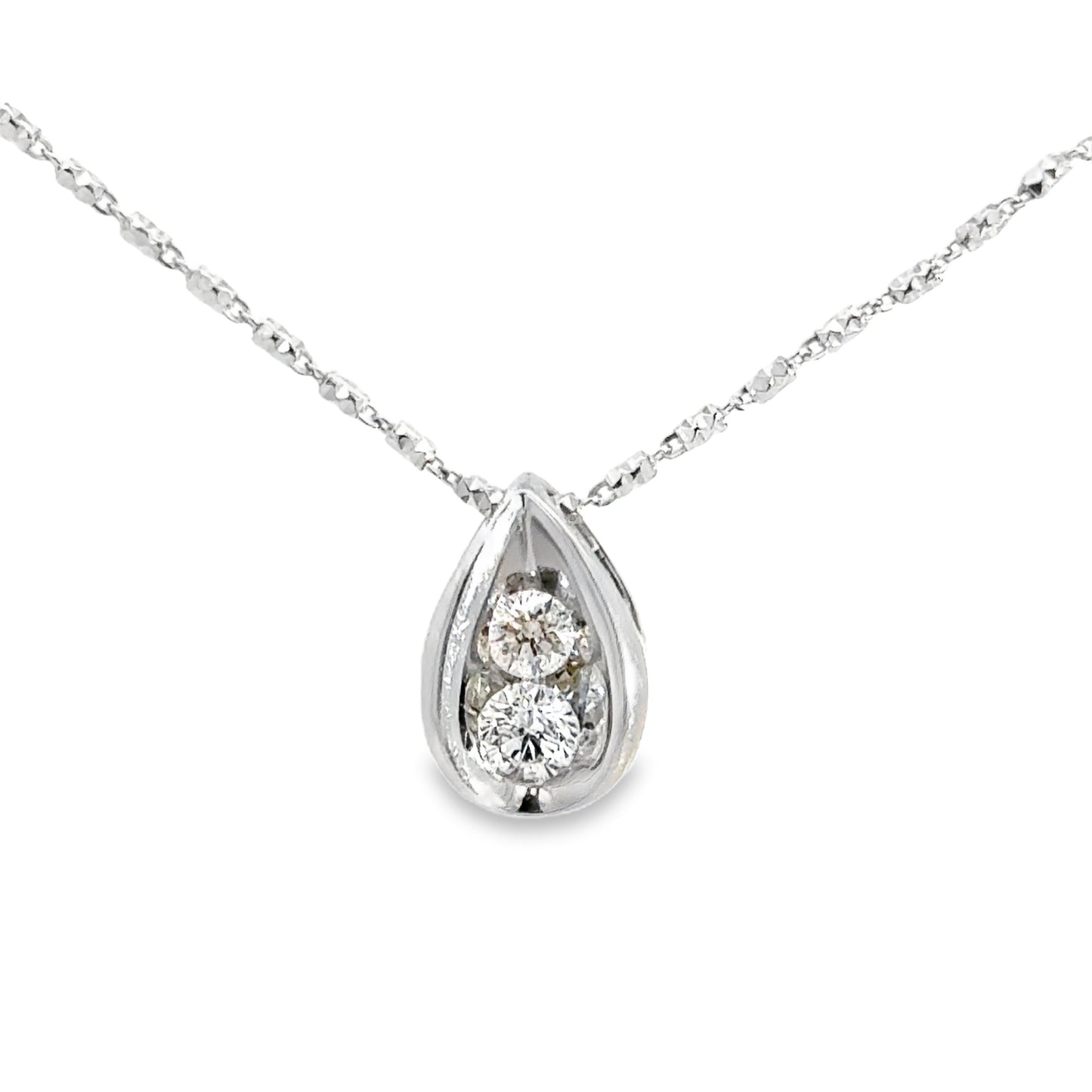 This delicate pendant necklace showcases two brilliant diamonds encased in a teardrop-shaped white gold setting. The delicate chain adds a touch of charm, making it perfect for both everyday wear and special occasions.